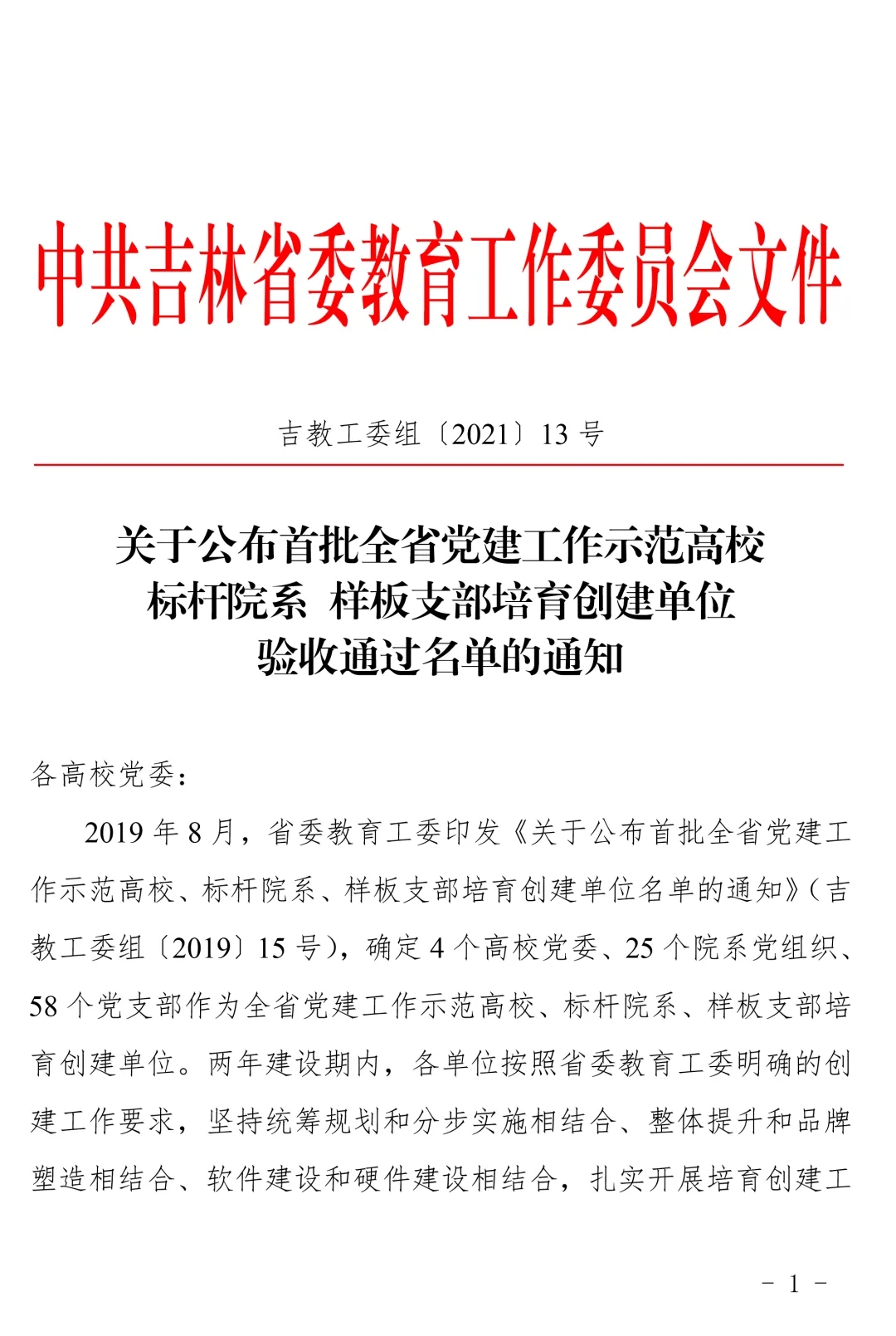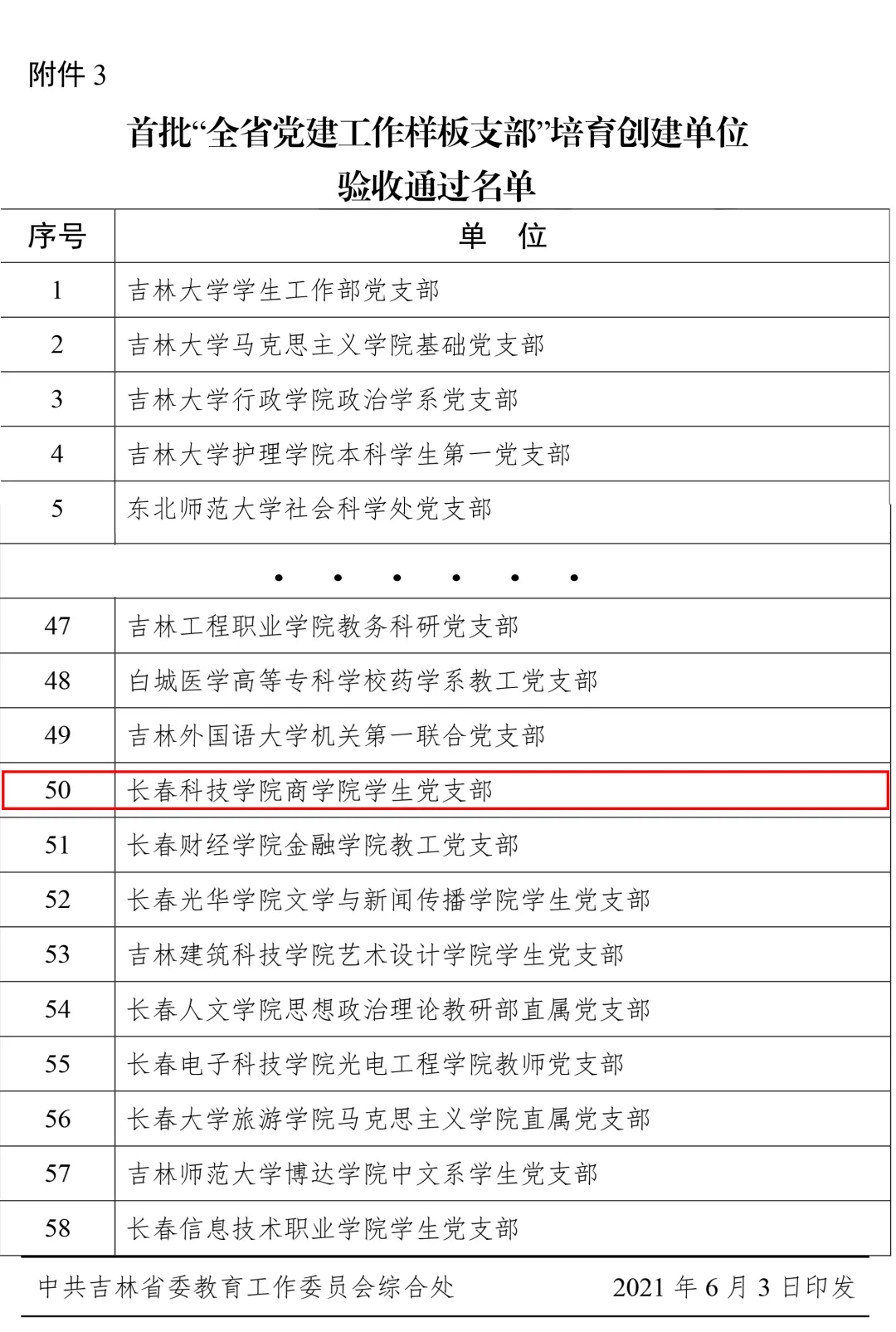 2019年8月中共吉林省委教育工委印发了《关于公布首批全省党建工作示范高校标杆院系样板支部培育创建单位名单的通知》,商学院学生党支部被确定为全省党建工作样板支部培育创建单位。在两年建设期内,学校党委、学院党总支、学生党支部高度重视样板支部培育创建工作,严格落实建设标准和要求,加强领导,精心组织,划步骤、分阶段开展支部培育创建工作。经过对标自查总结、满意度测评、复核审查,最终我院学生党支部顺利通过培育创建验收。