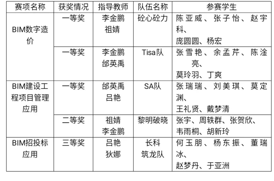 本届比赛内容是基于BIM技术的建筑建模、机电安装建模和综合应用、数字造价管理、招投标应用、建设工程管理等。我校学生参加了BIM数字造价、BIM建设工程项目管理、BIM招投标应用等几个赛项的比赛。具体获奖信息如下: