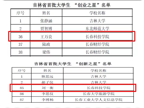 12月2日,吉林省教育厅公布《关于公布吉林省首批大学生“双创之星”评选结果的通知》。长春科技学院2017级毕业生王万良、刘一衡分别荣获“创业之星”、“创新之星”称号。
