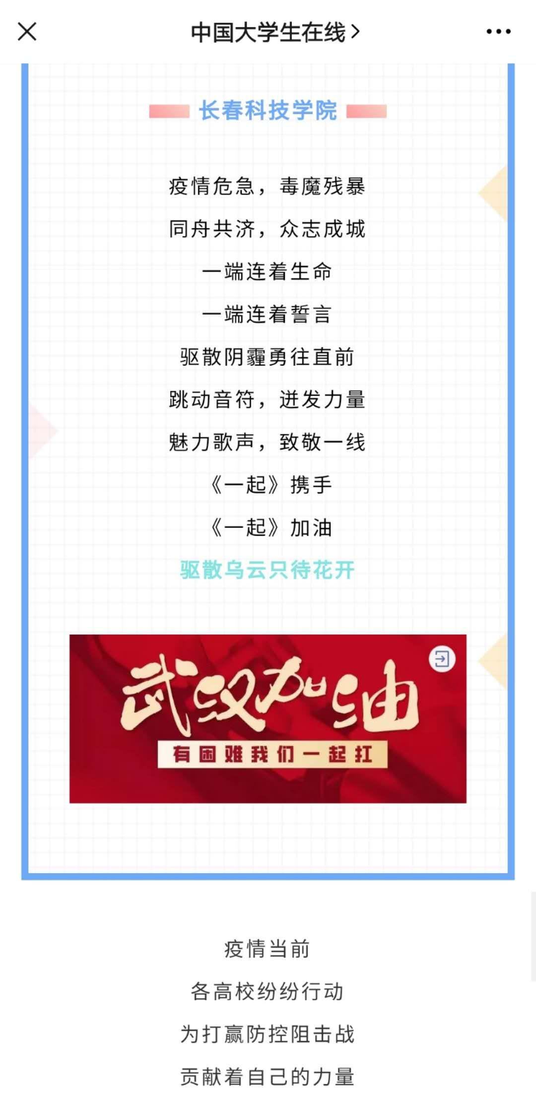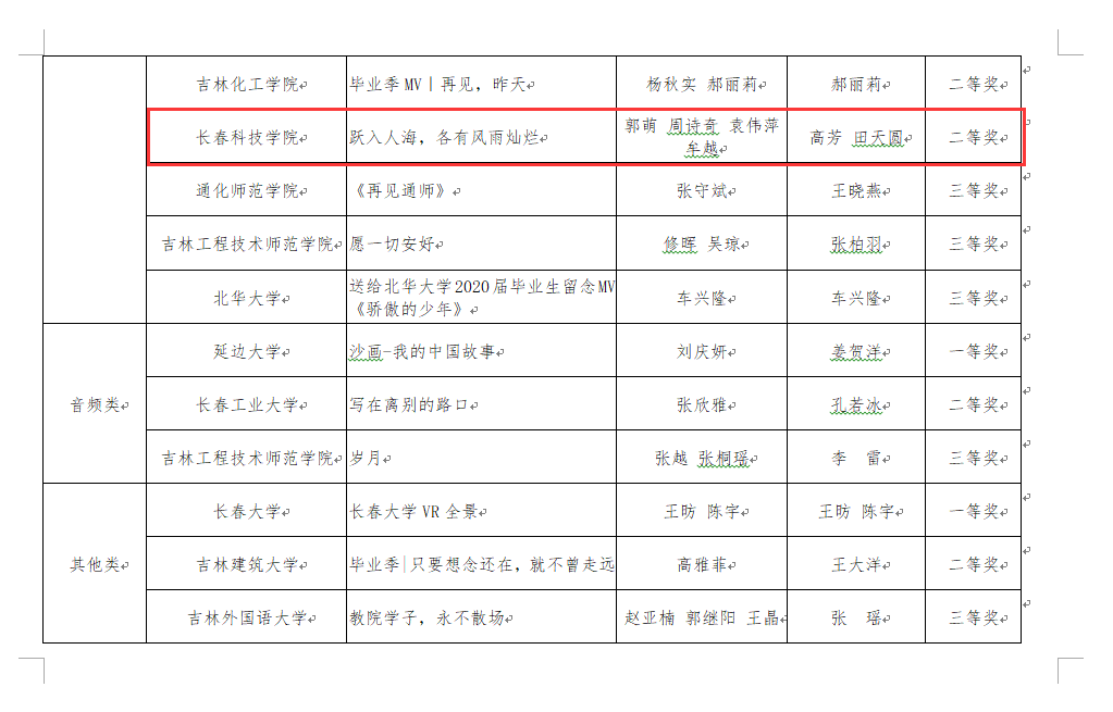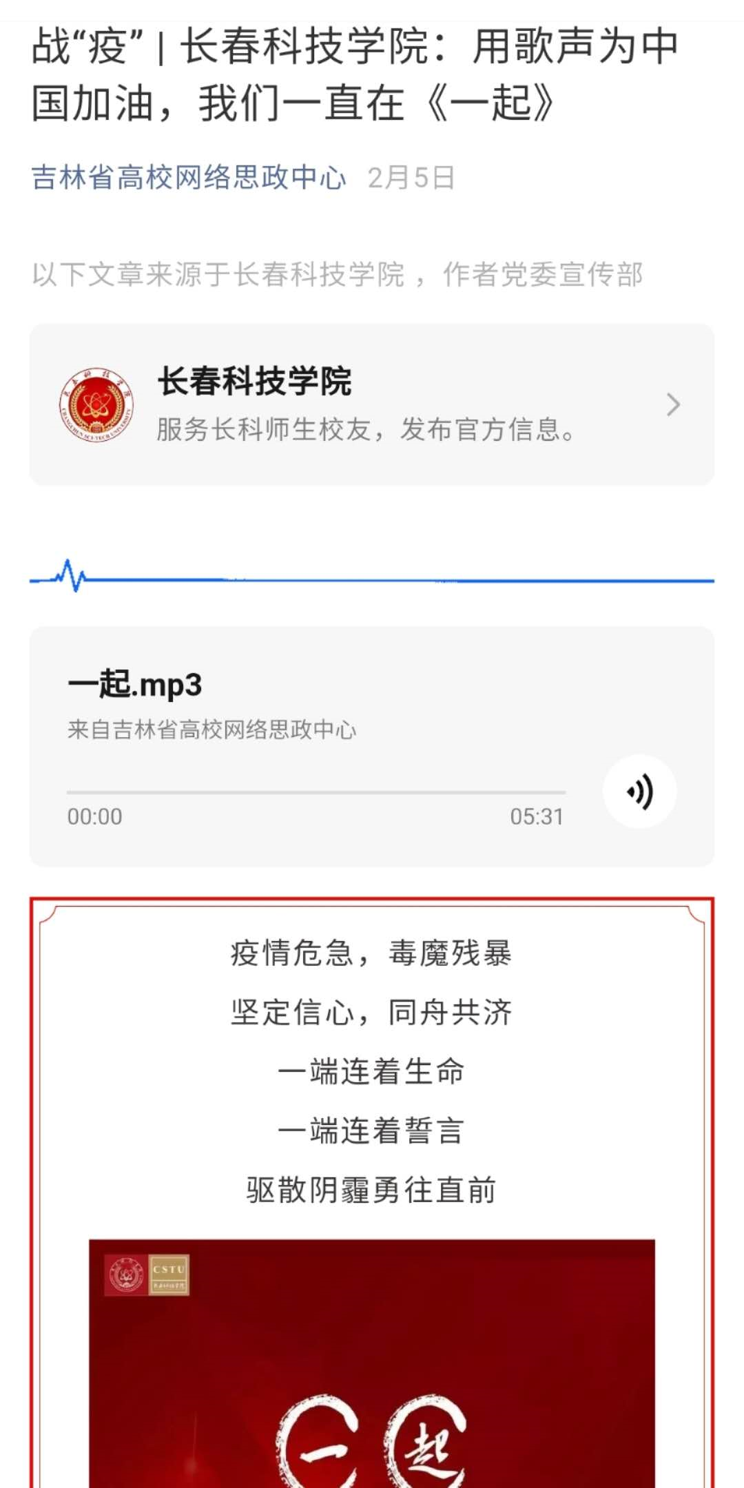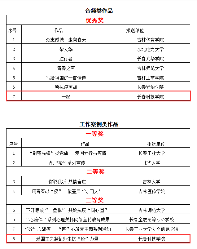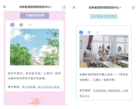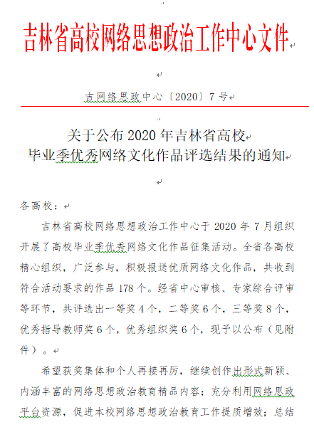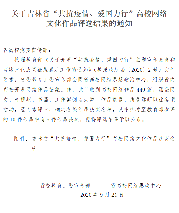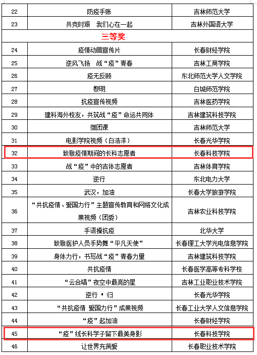 9月3日、21日,吉林省高校毕业季优秀网络文化作品、“共抗疫情、爱国力行”高校网络文化作品评选相继揭晓,我校上报的作品《跃入人海,各有风雨灿烂》荣获优秀网络文化作品奖;《致敬疫情期间的长科志愿者》《“疫”线长科学子留下最美身影》获评三等奖;音频作品《一起》荣获优秀奖;《爱国主义凝聚师生抗“疫”力量》荣获工作案例类三等奖。