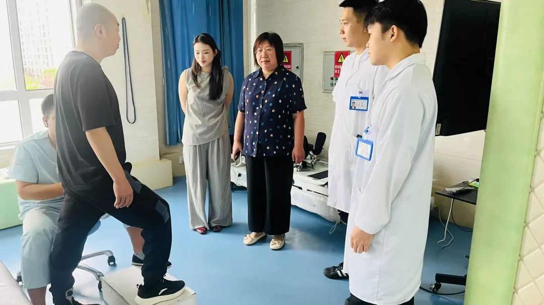 在康复治疗区,同学们正协助患者进行肢体功能训练,动作规范、态度耐心;实习生们熟练指导患者康复训练,与患者沟通亲切自然,展现出扎实的专业素养。