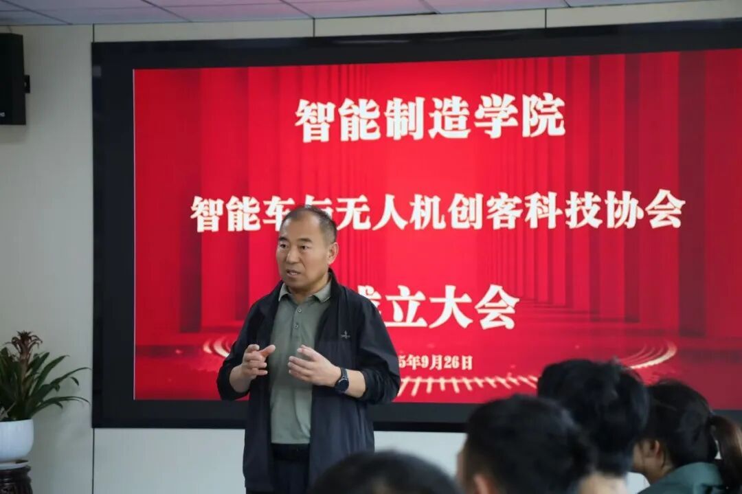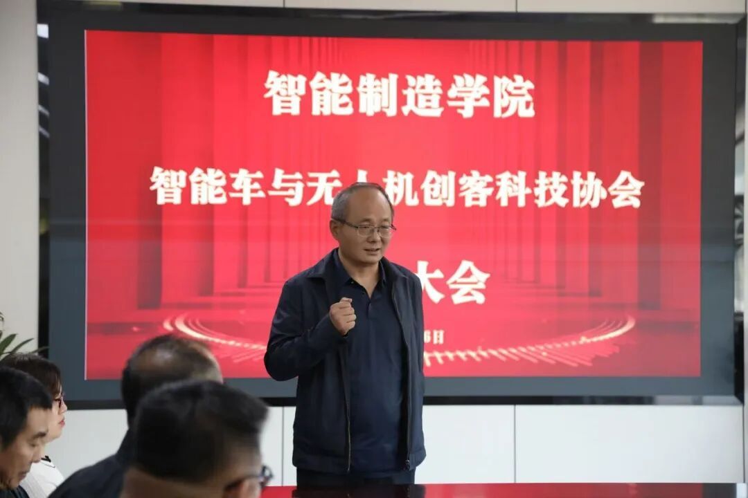 为开展智能制造学院智能车与无人机创客科技协会成立大会,近日智能制造学院在一教1211会议室进行成立仪式,出席本次会议的有学院党总支书记、院长杨继,党总支副书记、副院长臧连兴,副院长隋庆茹,新能源汽车工程专业付建国主任,苏承慧教授,学工办主任张健老师及新能源专业老师,会议由李文亮同学主持。