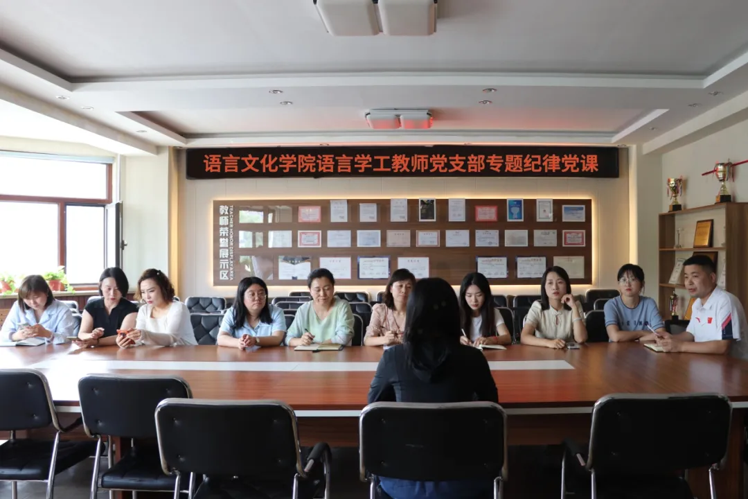 2024年6月24日11:10,语言学工教师党支部于第一教学楼217召开专题纪律党课。此次会议由语言学工教师党支部书记张晶主持,语言文化学院党总支副书记张贺亮,学生党支部书记姜月,语言学工教师党支部组织委员张凯旋及全体教师党员参加。