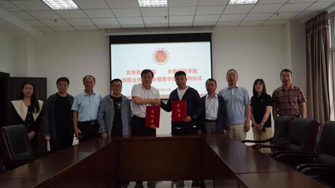 最后,长春科技科技学院副校长张代治与农安县中医院书记兼院长张生旭正式签订协议并合影留念。