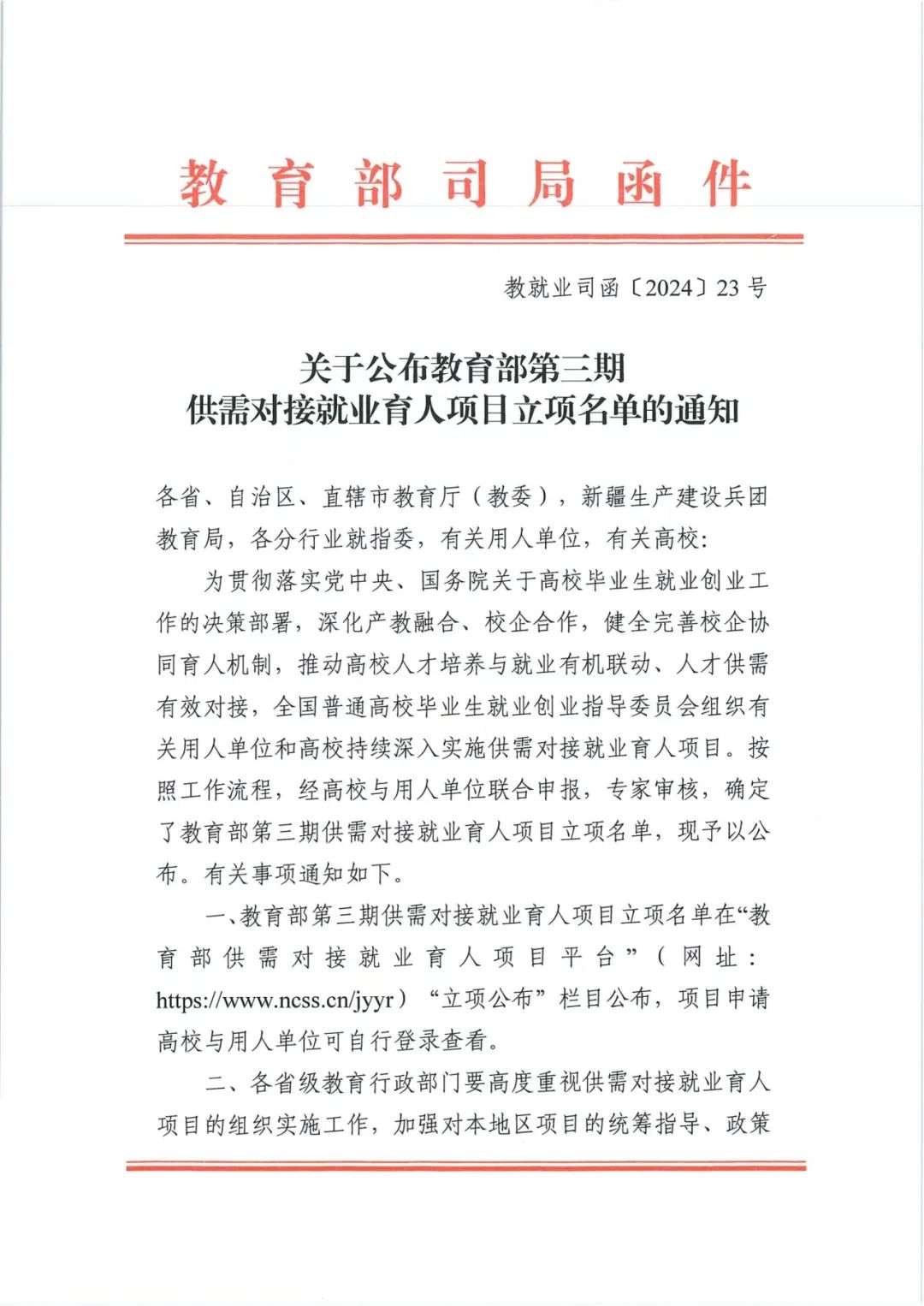 近日,教育部公布《第三期供需对接就业育人项目立项名单》,新媒体学院与育凤智联(北京)信息科技有限公司共同申报的“数字创意人才培养模式探索与创新”获批立项。此项目是学校首批获得的教育部供需对接就业育人项目之一。