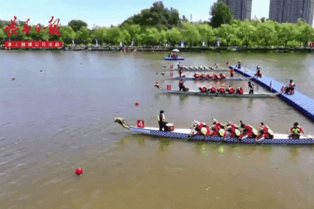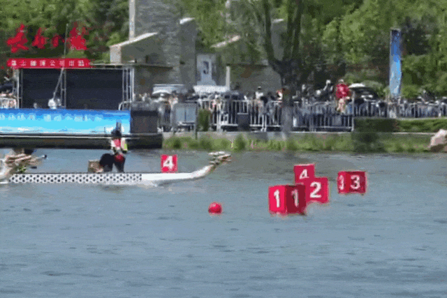 现场,疾驰的龙舟、飞溅的浪花与锣鼓声、欢呼声交织成一片热闹欢腾的节日氛围。水面上,桨手们伴着锣鼓手敲打的节奏,一边喊着号子,一边弯腰低头划桨,他们动作整齐划一,劲头十足,你追我赶,掀起的阵阵水花仿佛巨龙奔腾,场面壮观。运动员们配合默契,动作整齐划一,每一次桨落都充满了力量与激情。