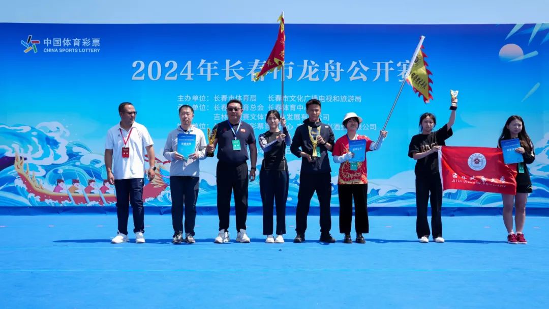 长春科技学院龙舟队获得高校组总成绩亚军(左二)