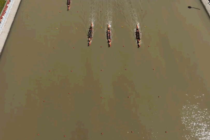 棹影斡波飞万剑,鼓声劈浪鸣千雷。一声令下,石溪河水面水花四起、鼓声阵阵,四支龙舟队如离弦之箭在石溪河上劈波斩浪。号子声和着鼓点此起彼伏,龙舟队员们随着鼓点节奏,奋力挥动手中的划桨,动作整齐,一艘艘龙舟如离弦之箭在水面上劈波斩浪。