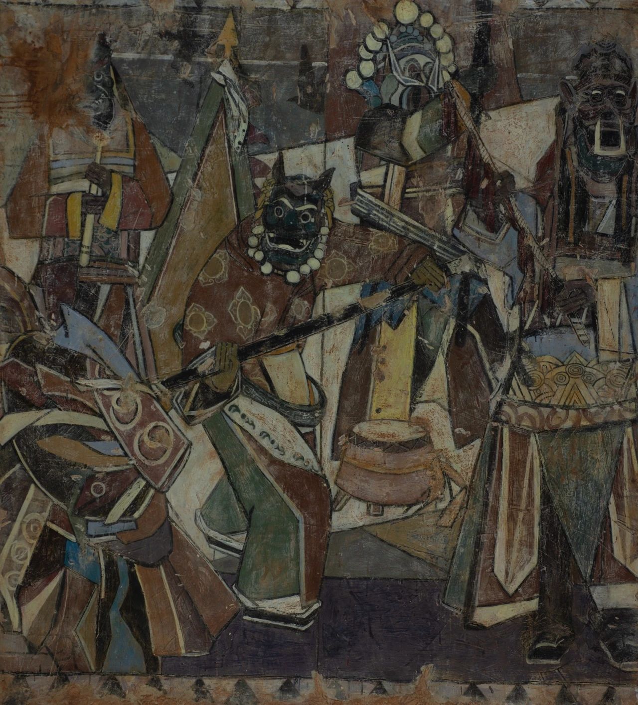 在这幅画作中,我们可以看到傩戏面具的神秘与力量,感受到祈福仪式的庄重与神圣。色彩的运用大胆而和谐,线条的处理流畅而富有张力,整个画面充满了动感和节奏感,仿佛能听到古老的鼓点与吟唱,感受到人们对美好生活的向往和祈祷。
