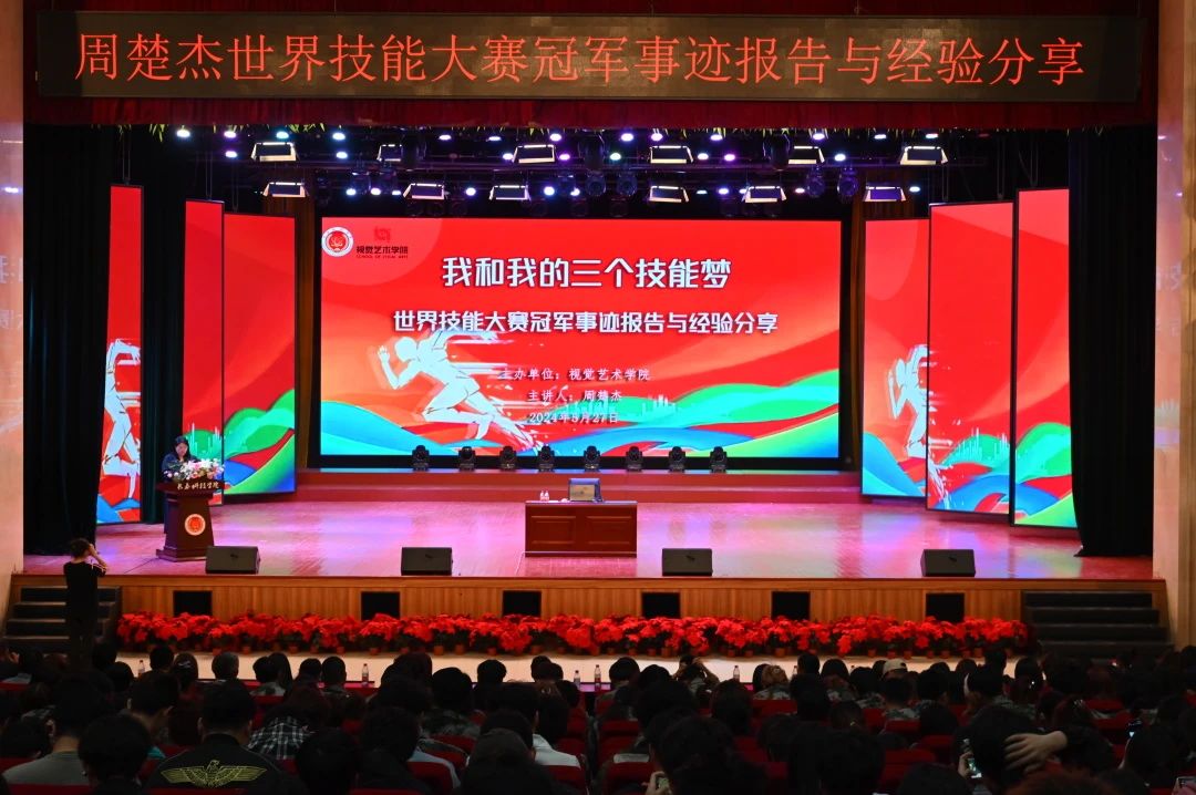 为深入学习宣传贯彻党的二十大精神,聚焦吉林“一主六双”高质量发展战略,激励更多青年一代走技能成才、技能报国之路,大力弘扬劳动精神、工匠精神。2024年5月27日,视觉艺术学院邀请世界技能大赛冠军周楚杰同志为该院师生作事迹报告与经验分享。报告会由视觉艺术学院党总支副书记山珊主持,学院全体师生聆听此次报告会。