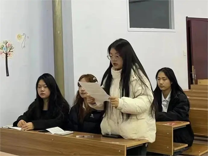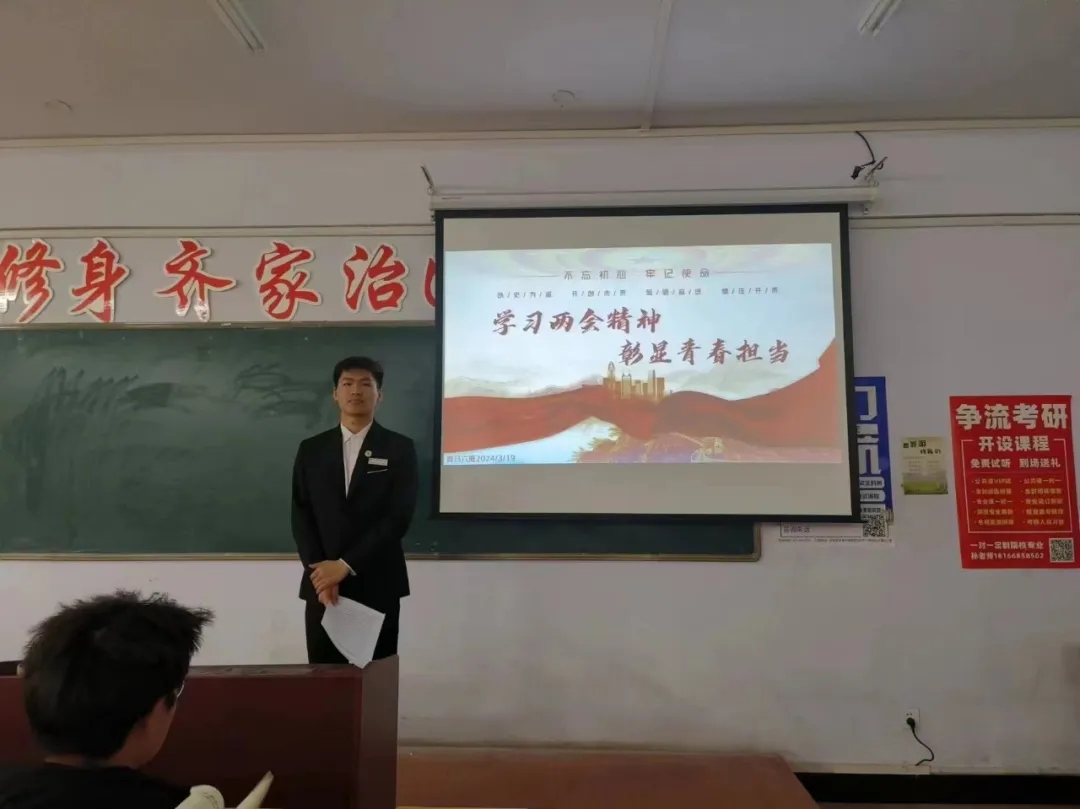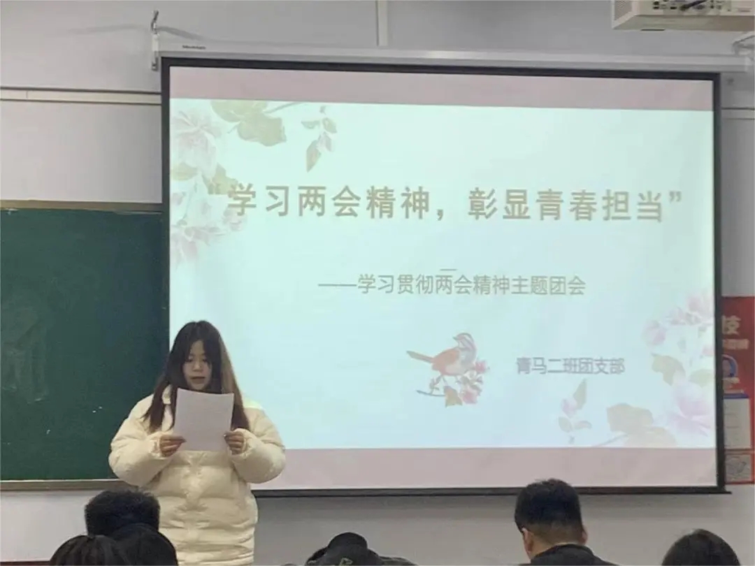 在青马三班的团会中,主持人沈欣虹带领同学们深入学习并领会今年两会精神,将其作为青年大学生坚定前行的行动指南,激励着青马学员跨步向前。