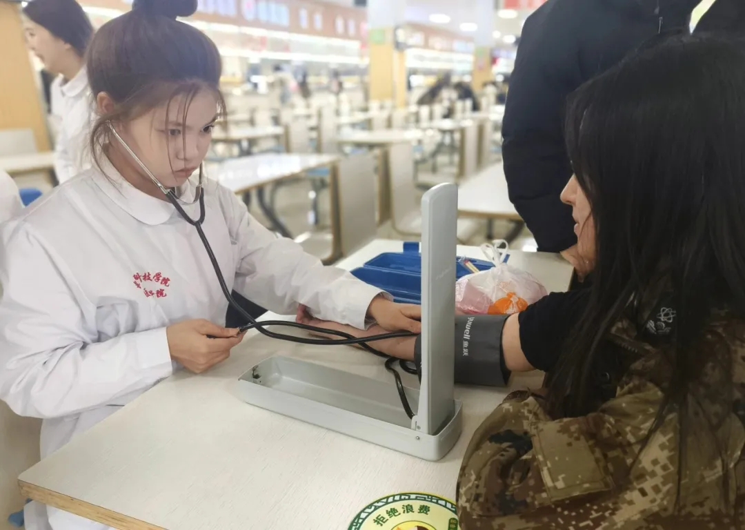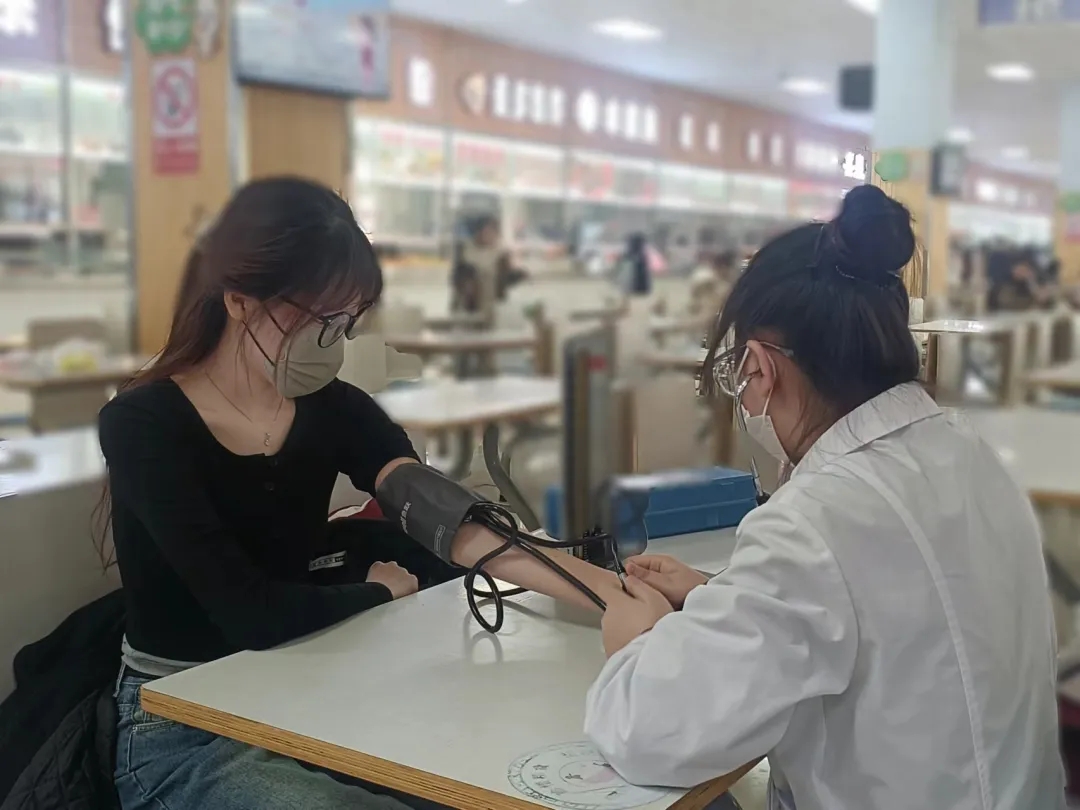 活动当天,血压测量点的志愿者们熟练运用实践技能操作血压计,认真地为大家测量血压。
