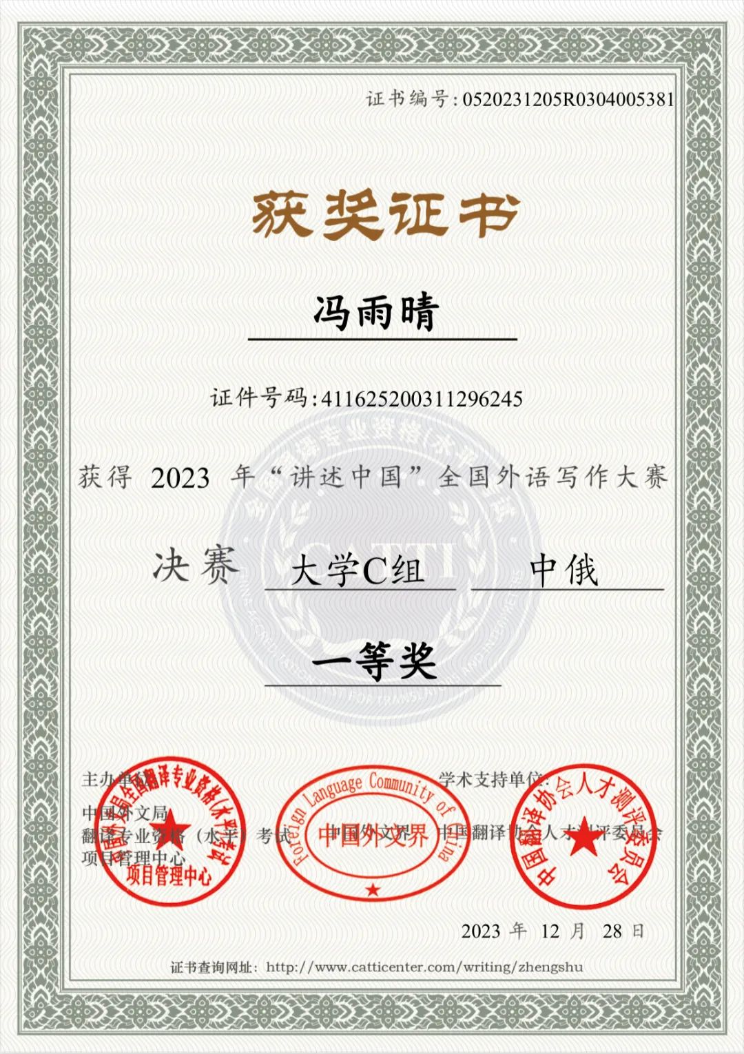 2023年12月28日,语言文化学院·新媒体学院学生在“讲述中国”全国外语写作大赛决赛中脱颖而出,喜获中俄一等奖。
