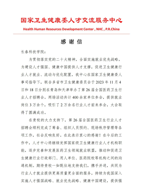 近日,国家卫生健康委人才交流服务中心给我校发来感谢信,对学校在医药卫生行业招聘活动中的精心组织和突出表现表示衷心感谢。