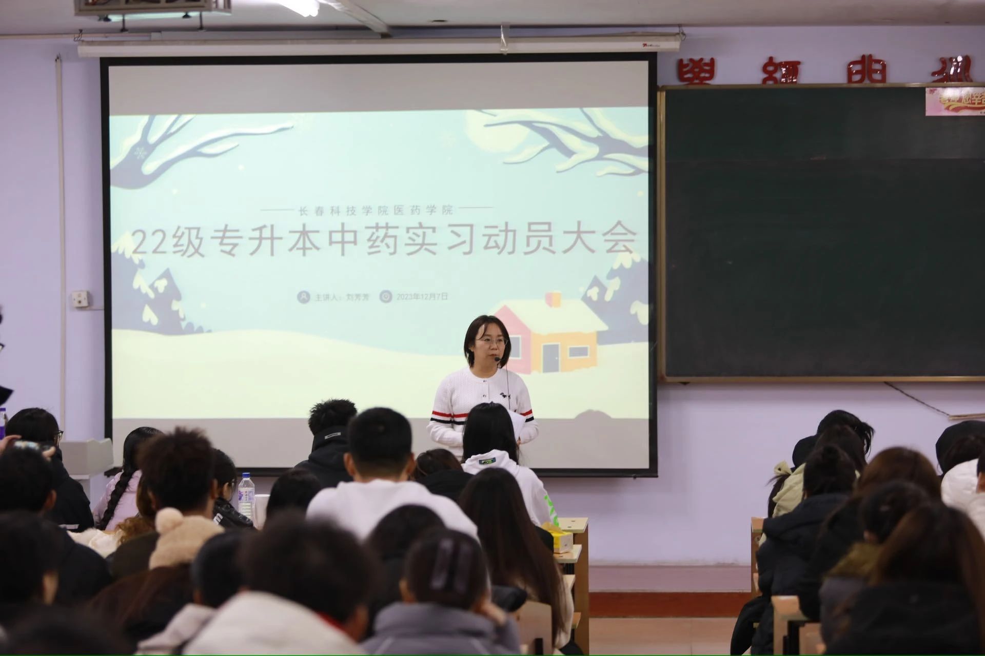 为进一步使医药学院专升本中药学专业学生做好毕业实习的各项准备,帮助同学们增强对实习岗位的理解与认识,明确实习目标,更快更好的了解、规划和适应实习,医药学院于12月7日下午16:30在第二教学楼2304召开22级专升本中药学专业毕业实习动员会。大会由学院中药学专业主任刘芳芳主持。