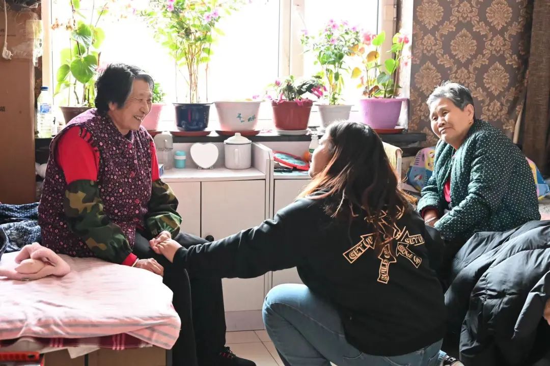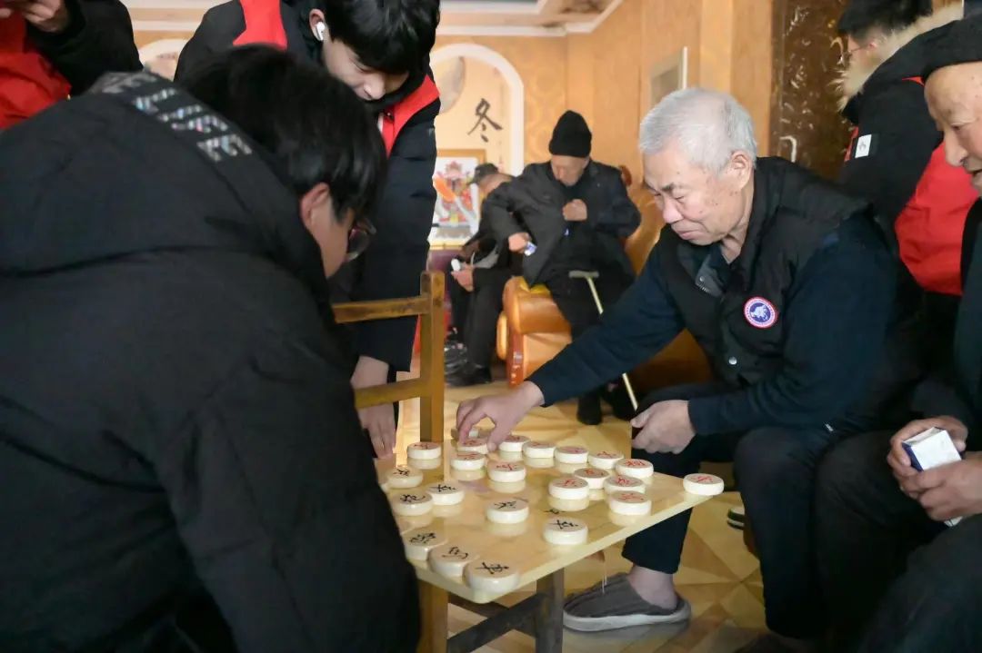 在活动过程中,队员们与长辈相处融洽温暖,有的坐在老人身旁聊天,有的俯身蹲下细心问候身体健康,有的跟长辈们一起下象棋,队员们与老人谈心、拉家常。