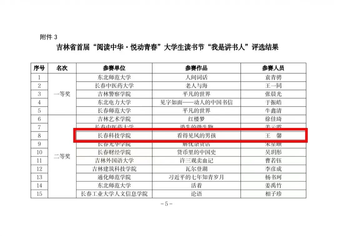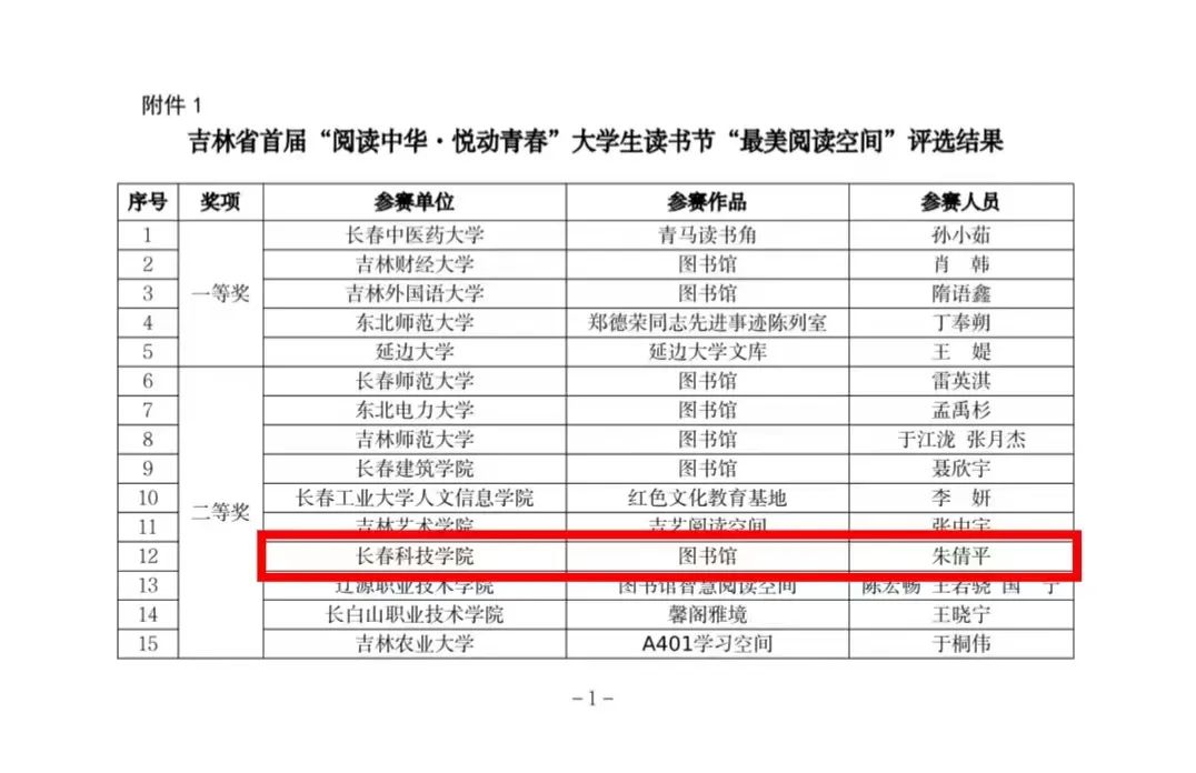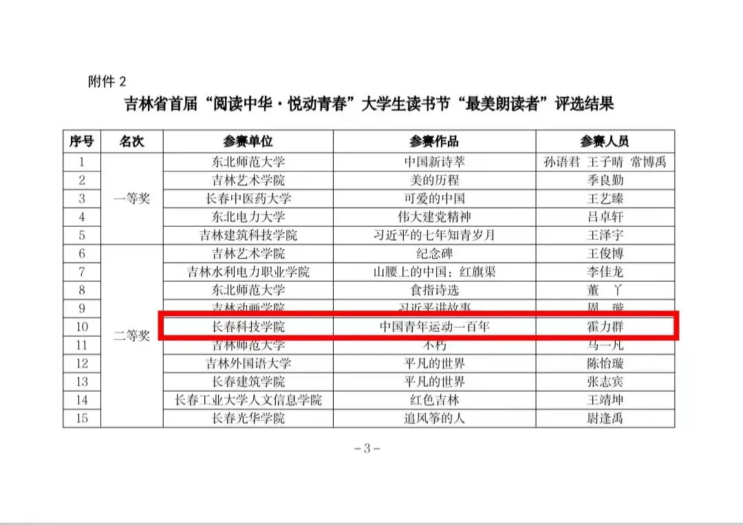 11月17日,由吉林省教育厅主办的吉林省首届“阅读中华 悦动青春”大学生读书节活动评选结果公布。长春科技学院在所有评选项目中获奖,共获得二等奖3项。
