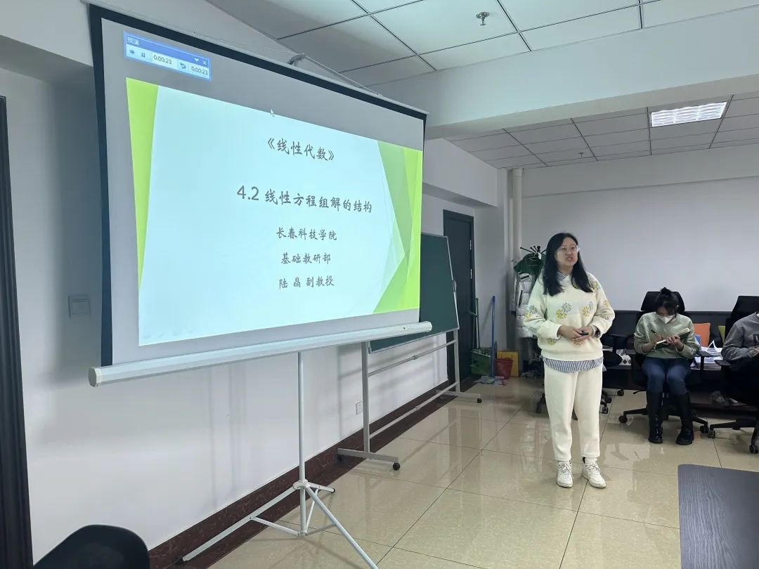 陆晶老师以线性方程组解的结构为参赛题目,分别从说课和现场教学两个方面展示教学内容。在教学过程中,陆晶老师以线上预习加巩固、线下教授加提升的教学模式讲授课程内容,教态自如、思路清晰,语言畅达,得到评审专家组一致好评。