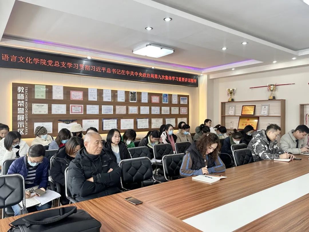 2023年11月13日12:00,语言文化学院党总支于第一教学楼217会议室组织学习贯彻习近平总书记在中共中央政治局第九次集体学习重要讲话精神。此次会议由语言文化学院党总支书记主持,副院长王巍,副院长林罡,学工办主任、分团委书记张贺亮,党总支组织委员付佳英,党总支宣传委员张卫亮,语言学工教师党支部书记张晶,公共外语教师党支部书记丁晓明以及党总支全体教师党员参加。
