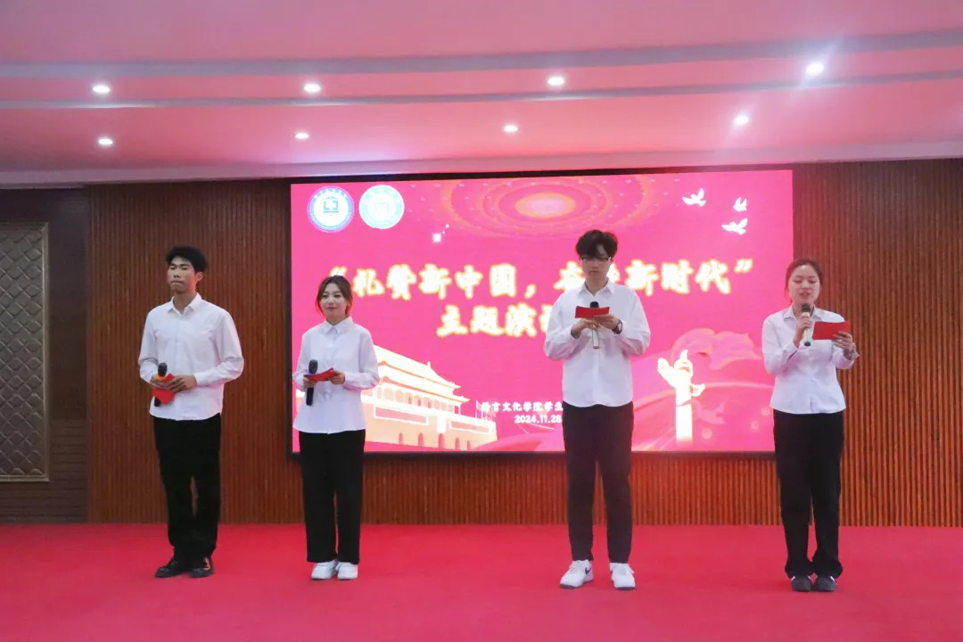 为弘扬时代精神,传承爱国情怀,展现学生专业素养,2024年11月28日13:30,语言文化学院·新媒体学院学生党支部于第一教学楼6楼报告厅组织举办“礼赞新中国,奋进新时代”多语种演讲比赛。语言文化学院·新媒体学院俄语专业主任李敏,日语、朝鲜语(韩国语)专业主任金秀英,公共外语老师徐宝鑫,网络与新媒体专业老师邹昆仑,辅导员老师姜月、韩墨、张凯旋、周文翰、隋岩出席,学院部分学生参加。此次大赛由2022级英语1班姚景阔、2022级英语3班廖梓伊、2024级小学教育4班刘金舒和2024级网络与新媒体3班相煜晗主持。