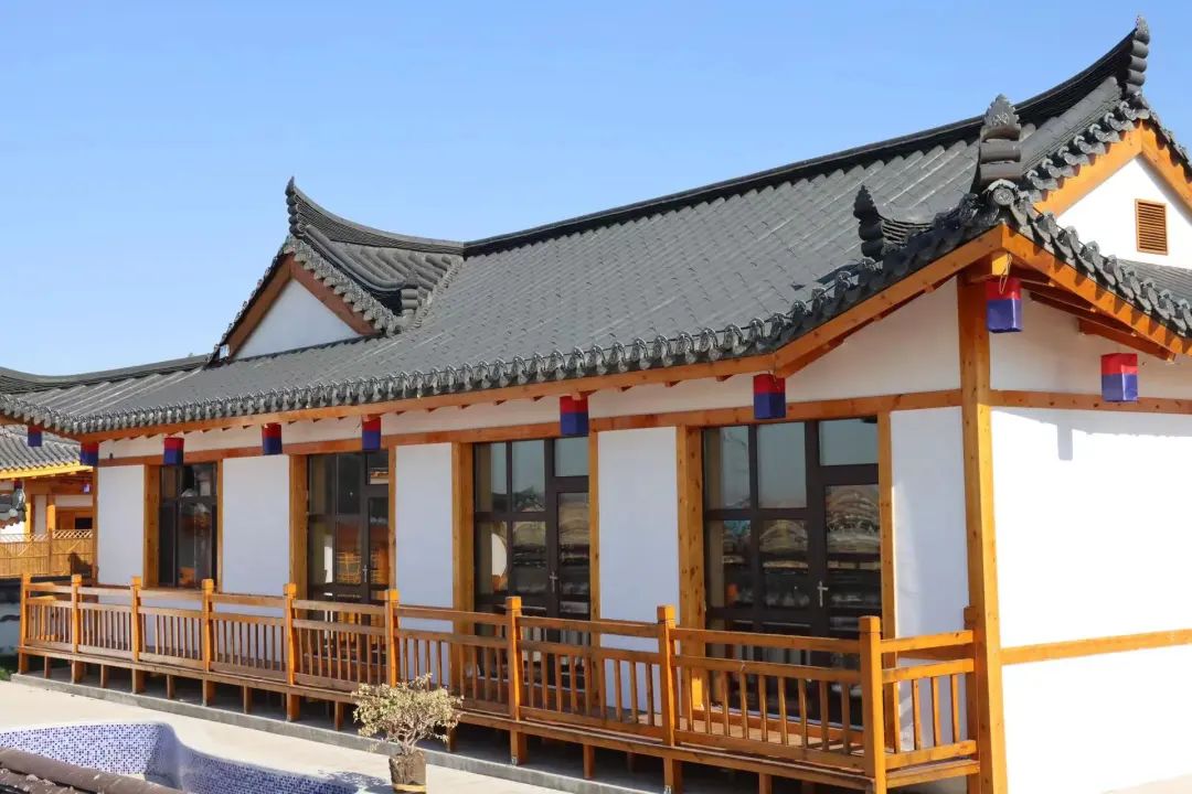 刚进入村庄,入眼就是一片极具朝鲜特色的房屋,房屋主体大多为白色,屋脊中间平坦如行舟,两端翘起似飞鹤,形成优美的曲线。