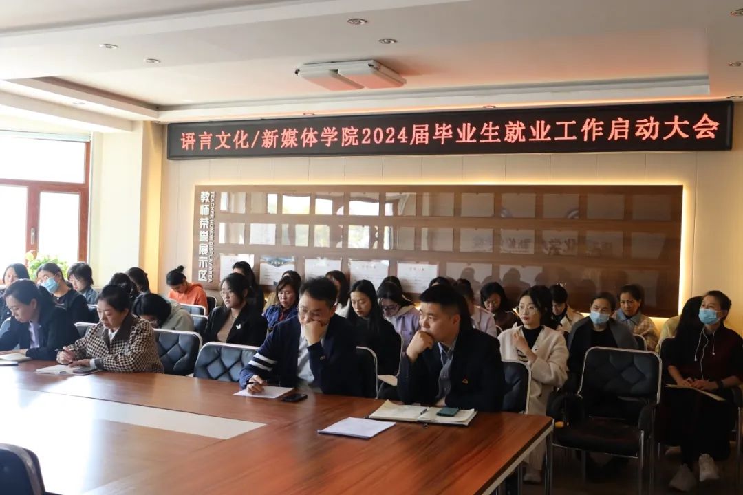2023年10月12日12:00,语言文化/新媒体学院于第一教学楼217会议室召开2024届毕业生就业工作启动大会。此次会议由语言文化/新媒体学院副院长王巍主持,语言文化/新媒体学院院长,学工办主任、分团委书记张贺亮,各专业主任,各年级辅导员老师以及全体教师出席。