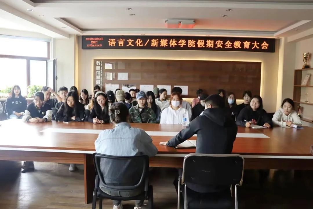 2023年9月26日,语言文化/新媒体学院于第一教学楼召开假期安全教育大会,此次会议由语言文化/新媒体学院学工办主任、分团委书记张贺亮,2021级辅导员姜月,2022级辅导员曹莹、韩墨,2023级辅导员张凯旋主持,我院2020级、2021级、2022级、2023级全体班级负责人参加。