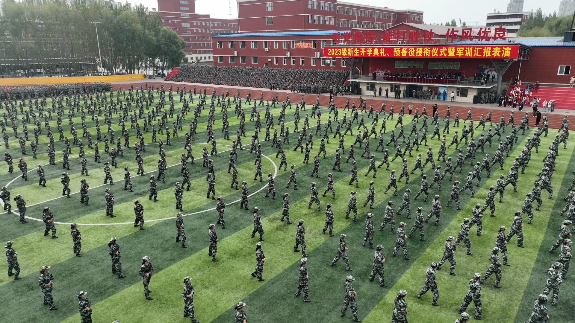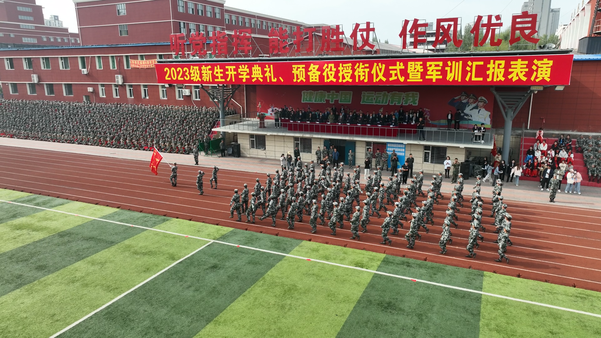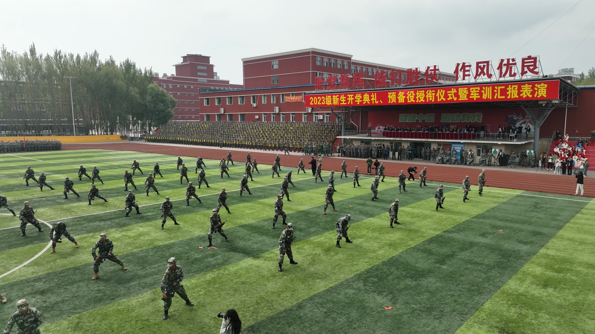 每一次的汗水,都是奋进的标志。每一次的呐喊,都是向上的力量。军训汇报表演中,新生们通过军体拳、刺杀操、战术演练等训练科目的演练,精彩地展现了军训塑造的良好风貌。