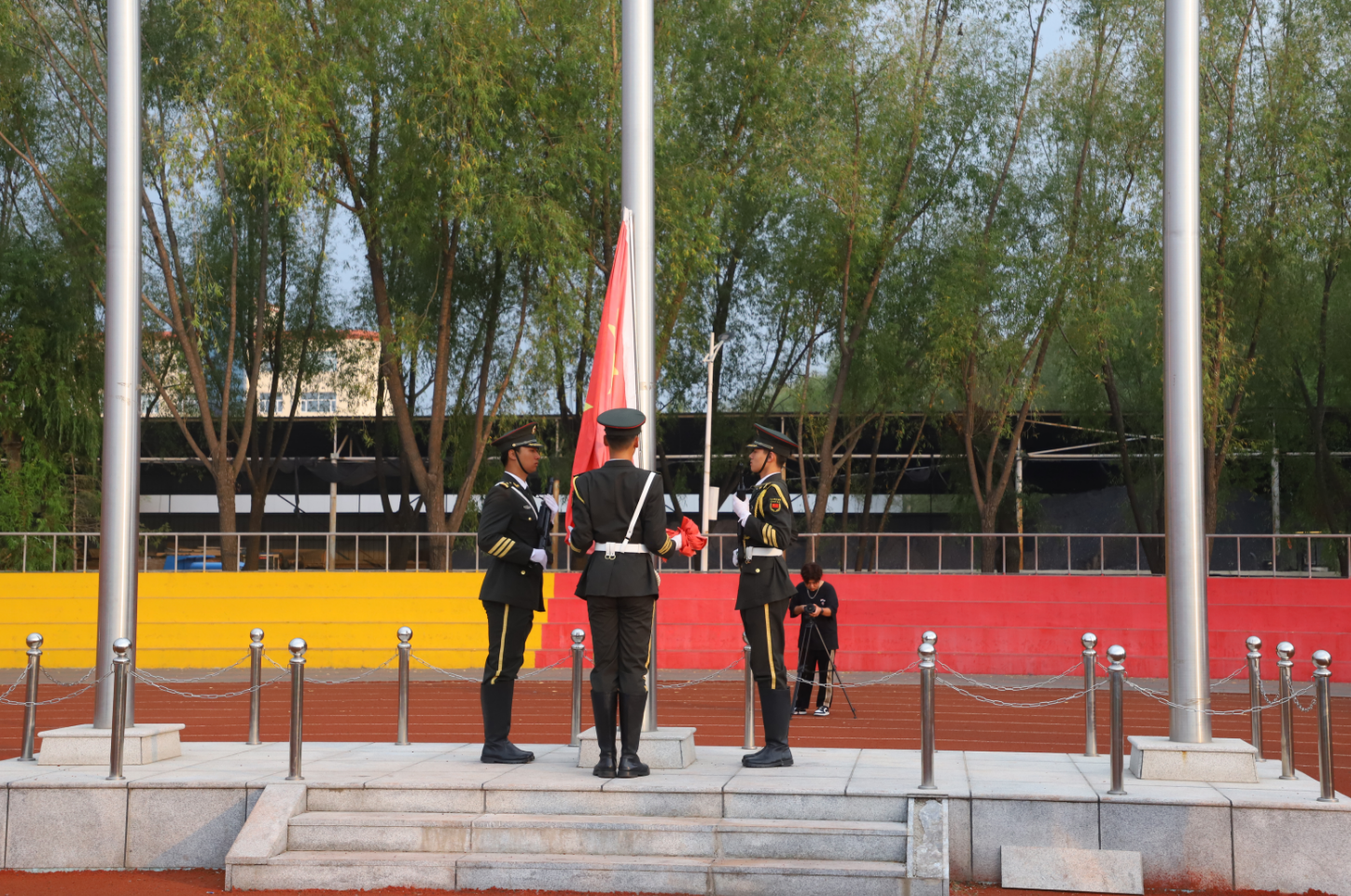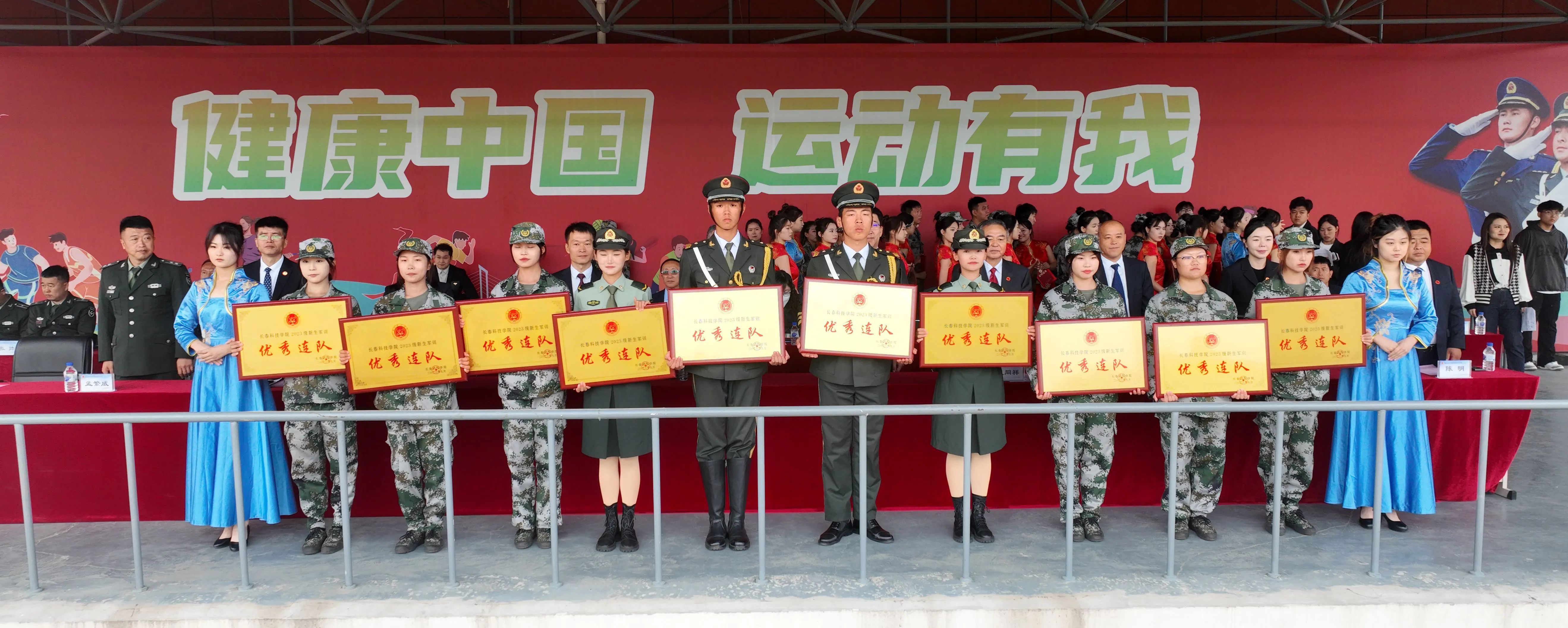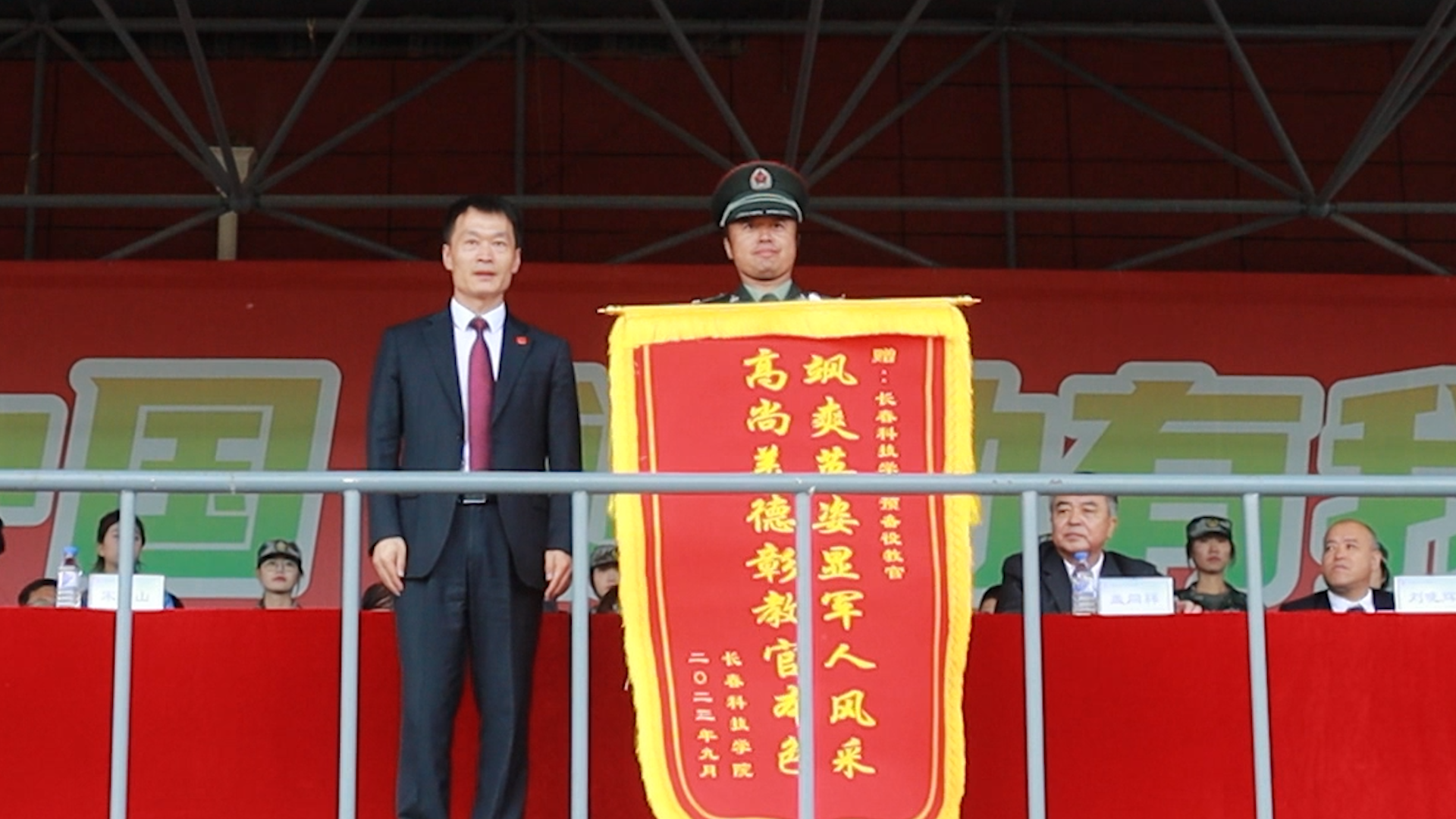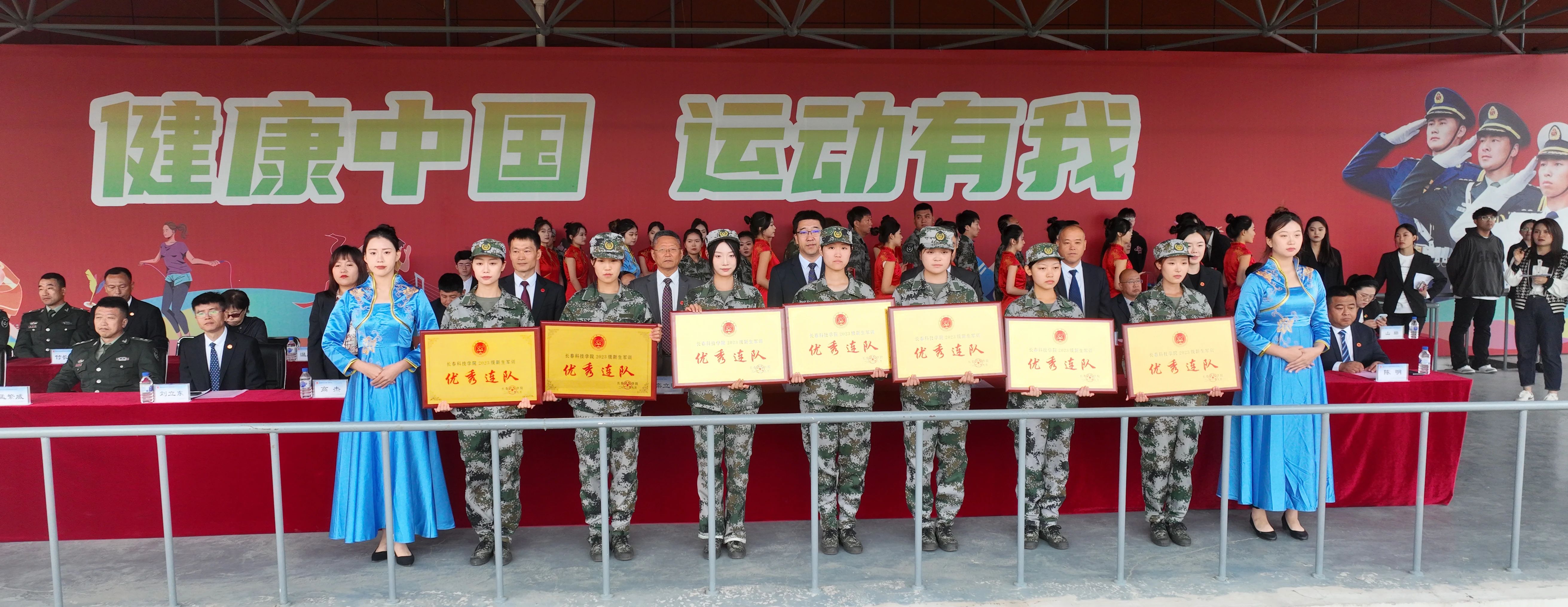 表演结束后,宋学山向预备役教官授予锦旗并宣读《关于表彰长春科技学院优秀军训教官、优秀预备役教官、国旗护卫队优秀旗手的决定》;高杰宣读《大学生预备役士兵授衔命令》。刘晓辉宣读《关于表彰军训团优秀训练标兵和优秀内务标兵的决定》;盖同祥宣读《关于表彰军训团优秀连队和优秀指导员的决定》。