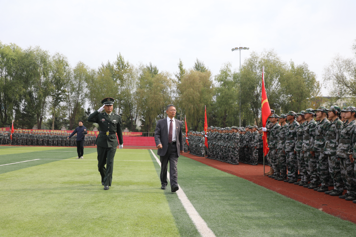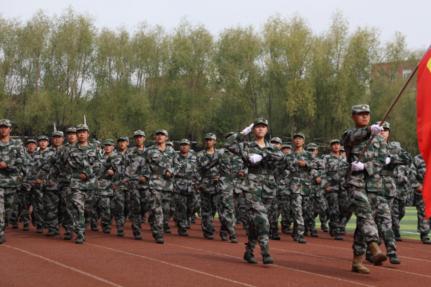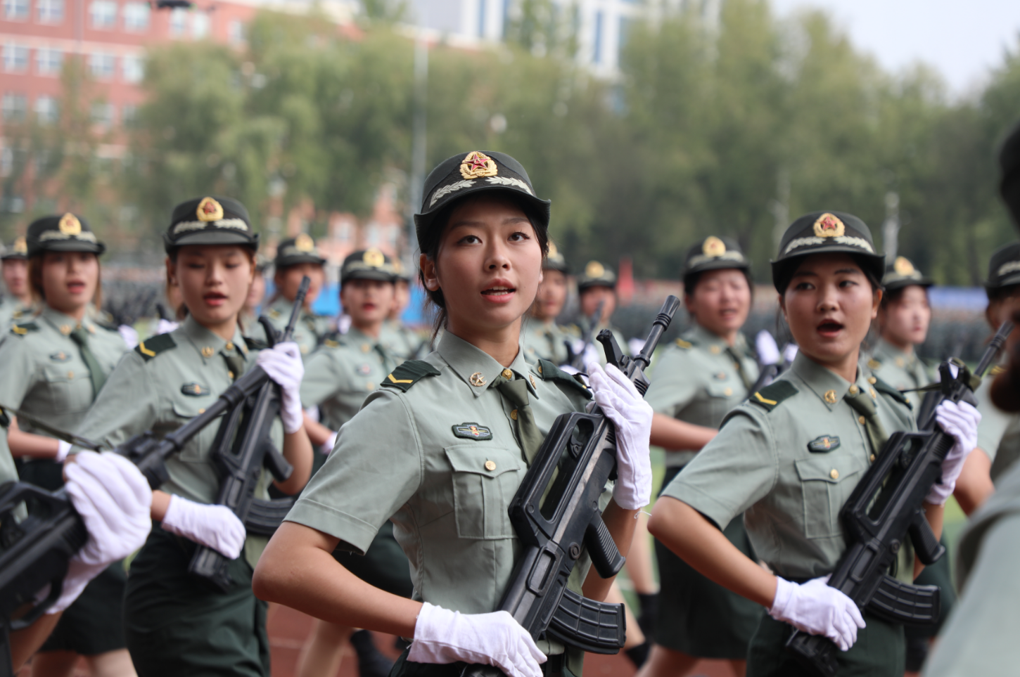 在庄严嘹亮的国歌声中,军训汇报正式拉开帷幕。随着学生处国防教育科科长曾健的一声令下,分列式开始。伴随着铿锵有力的乐曲,身着绿色迷彩服的方阵口号洪亮、步伐整齐、目光坚毅、英姿飒爽地依次经过主席台接受检阅。