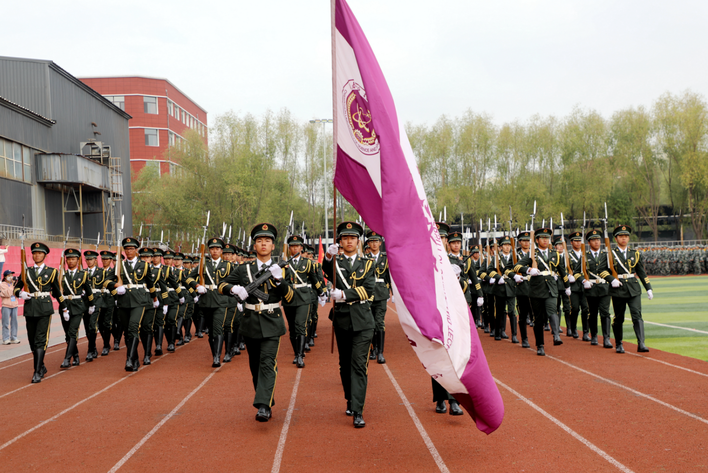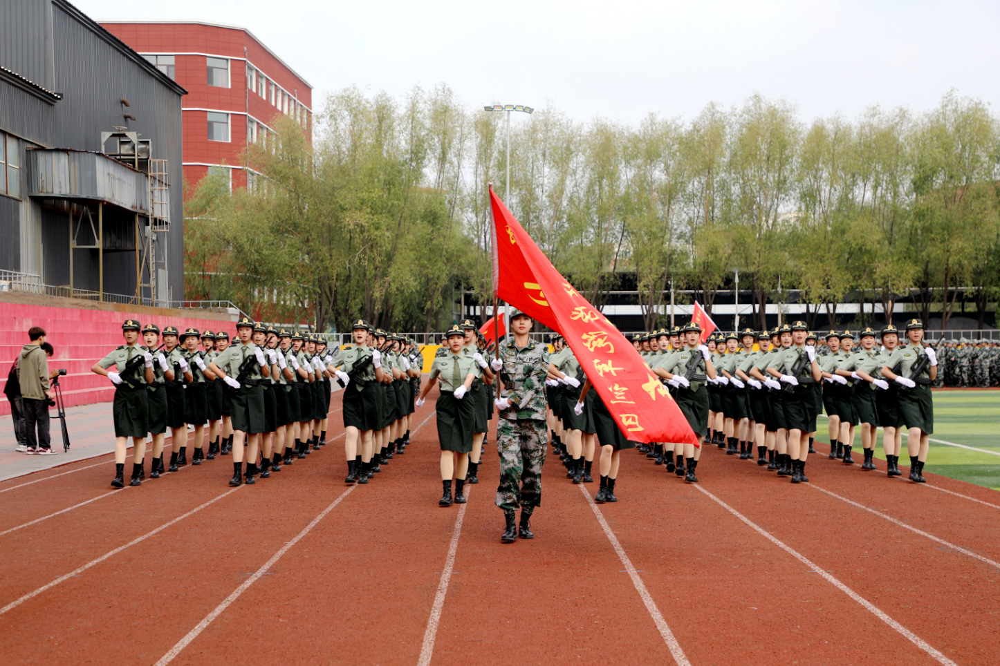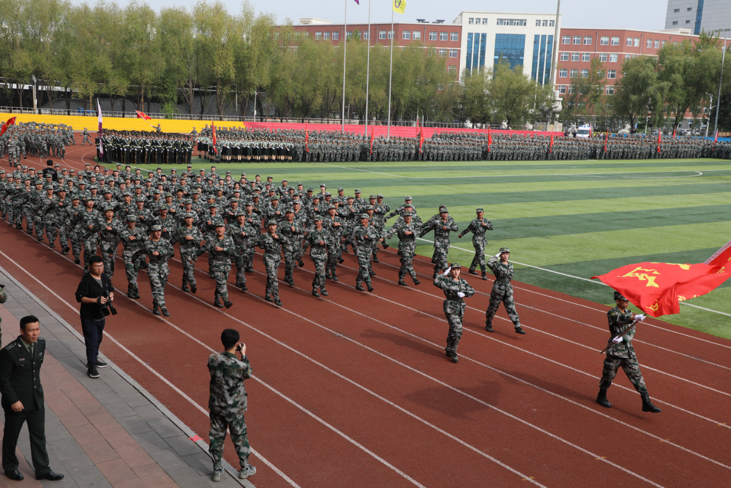 在庄严嘹亮的国歌声中,军训汇报正式拉开帷幕。随着学生处国防教育科科长曾健的一声令下,分列式开始。伴随着铿锵有力的乐曲,身着绿色迷彩服的方阵口号洪亮、步伐整齐、目光坚毅、英姿飒爽地依次经过主席台接受检阅。