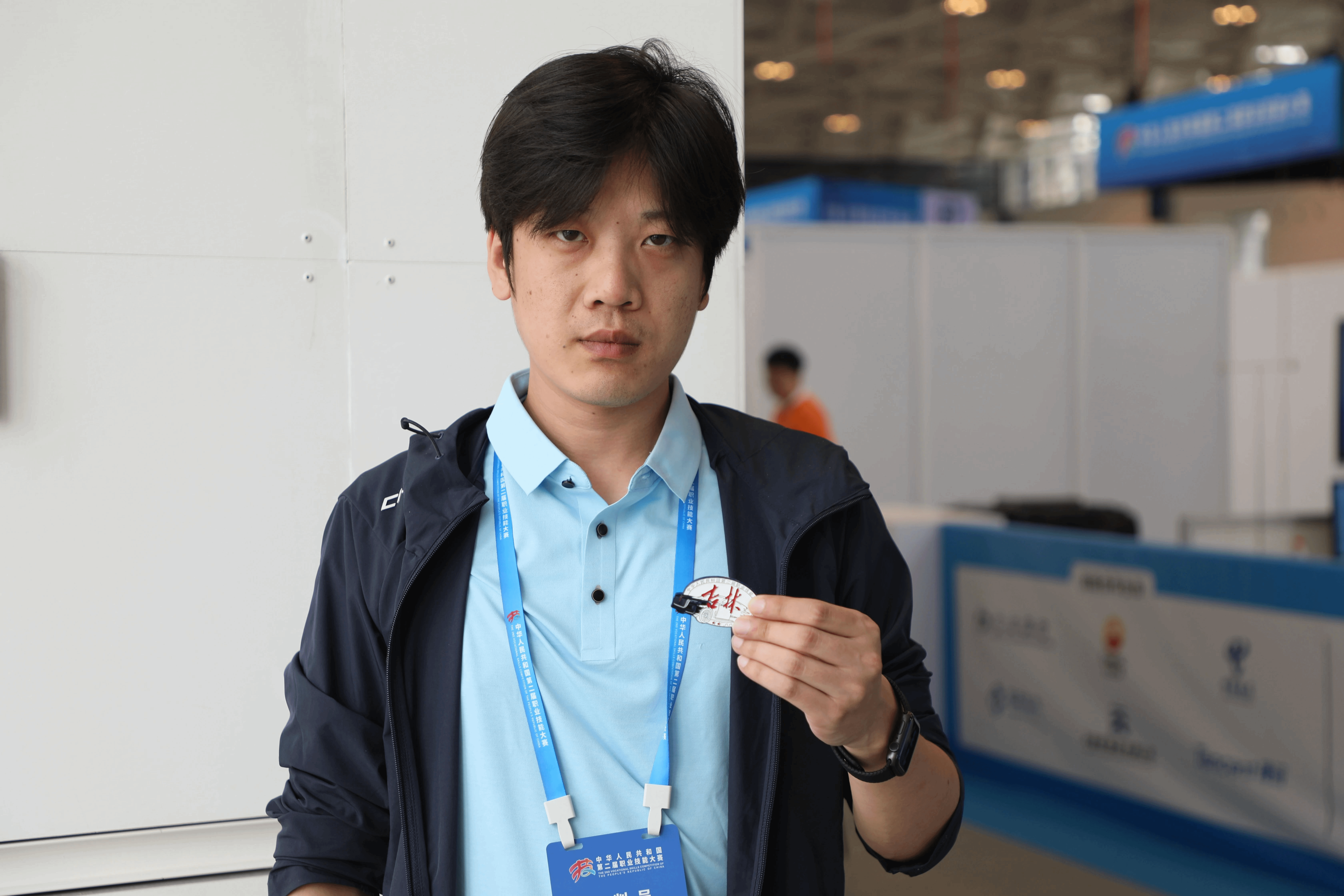 “徽章正中间的吉林二字使用了象征工匠精神传承的红色,徽章周围采用了‘景泰蓝’的蓝色代表了传统技艺,徽章下方两颗红星代表第二届全国技能大赛,徽章左下角的红旗H9展示了吉林省民族汽车品牌,车头微微上抬与车尾线条状设计代表了向前冲的动势,也寓意着希望此次大赛,我们的成绩将有所提升和突破,徽章设计共用时一个半月。”吴明伦介绍。