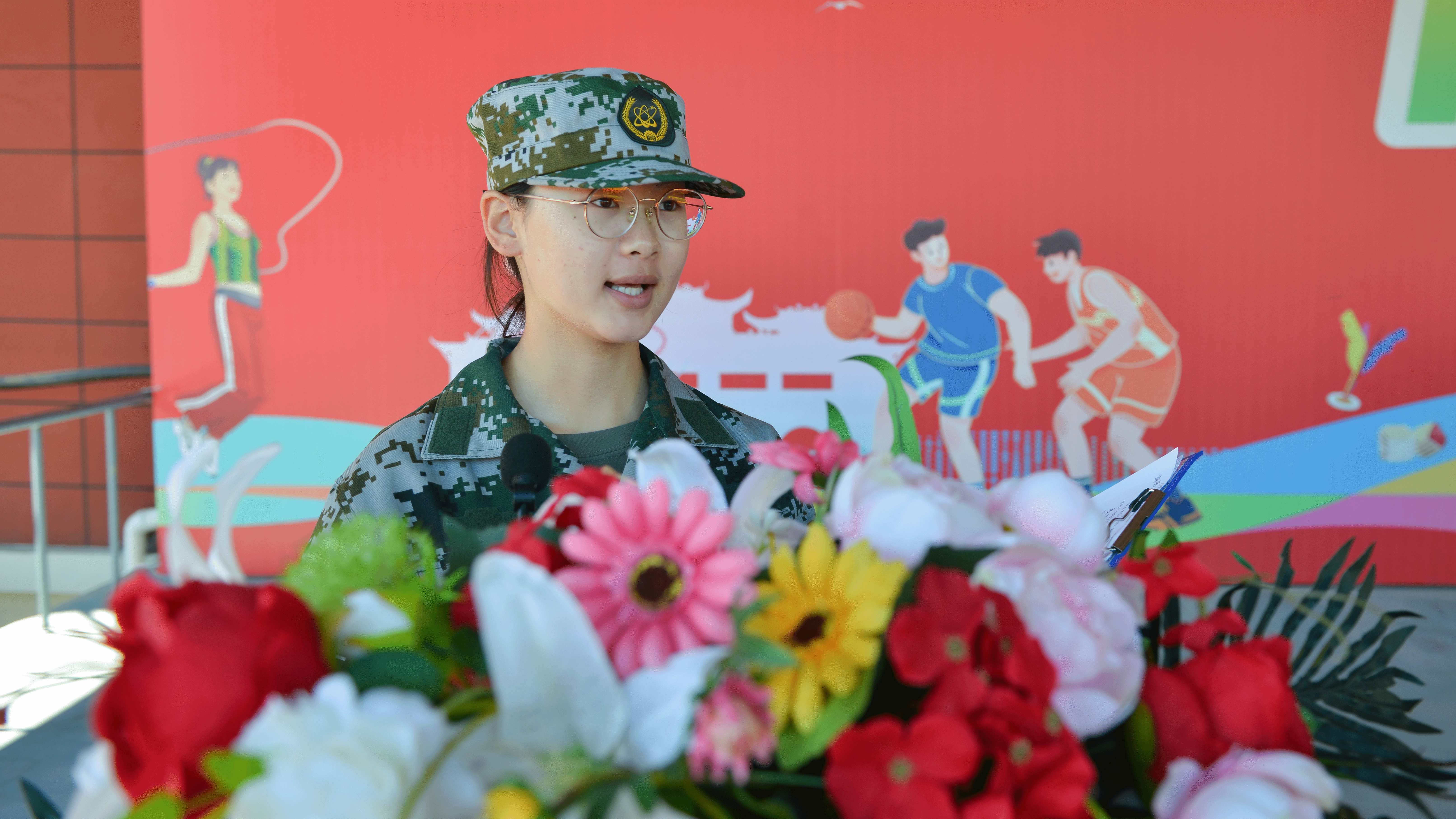 医药学院2023级康复治疗2班王芮滢代表受训学生发出承诺,以新时代青年昂扬姿态,新时代追梦人的豪迈气魄,高标准、高质量完成军训任务,用赤诚之心在长科崇德至善、笃学强能。