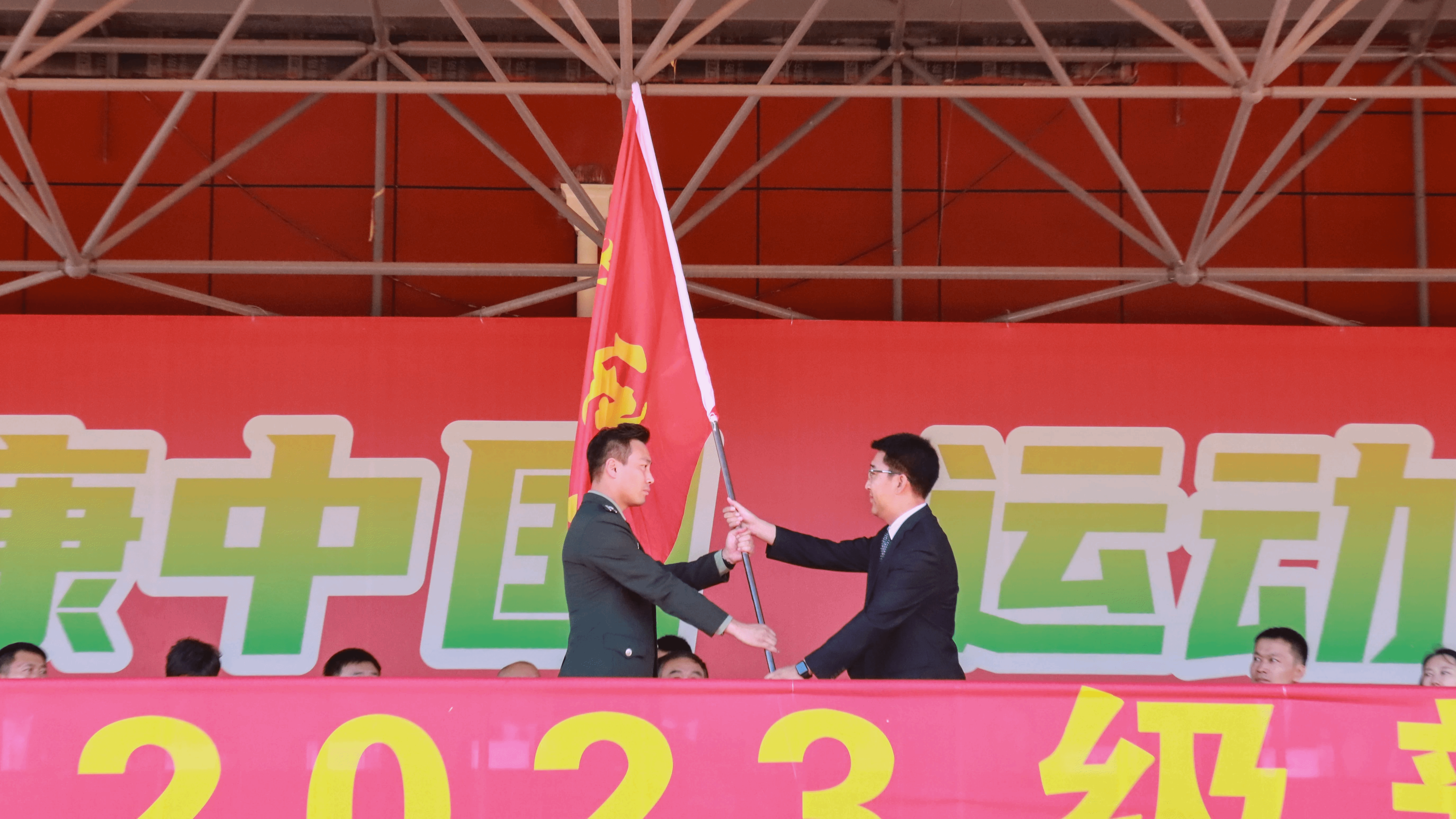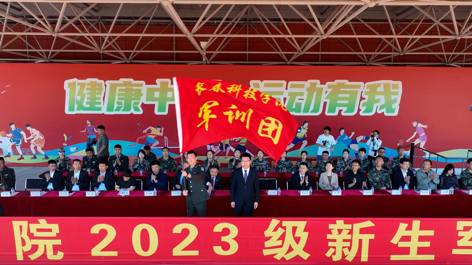 (党委书记林佳彬向军训副总指挥吴彬授长春科技学院军训团团旗)