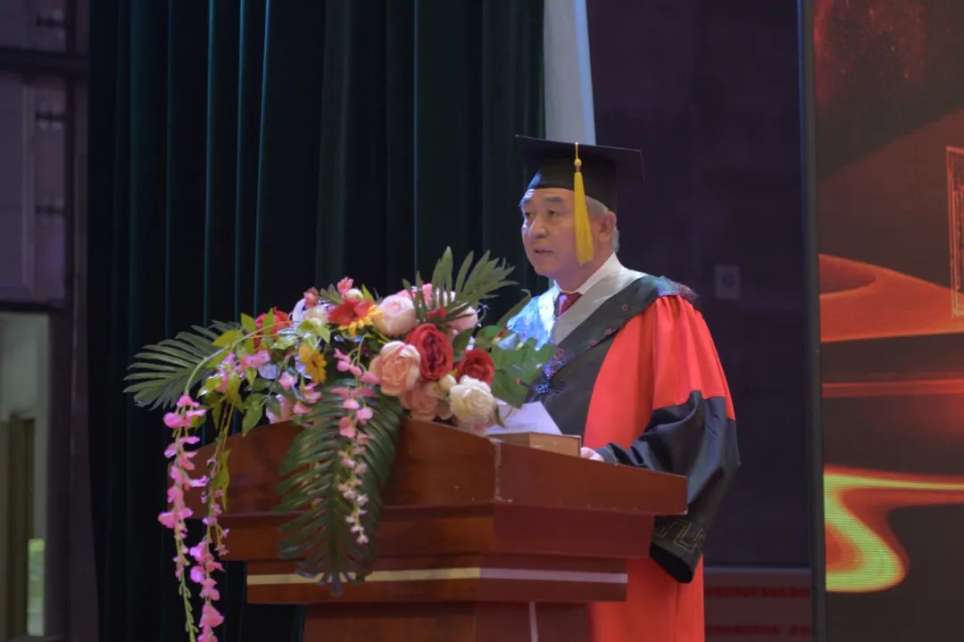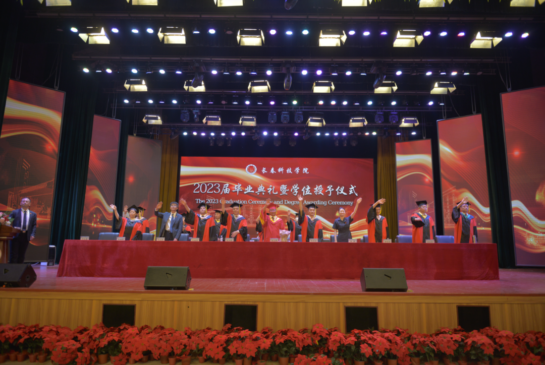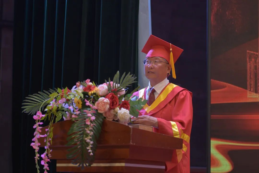 典礼上,校长栾立明代表学校向圆满完成学业的2023届毕业生表示祝贺,对即将离校的毕业生表达了最真挚的祝福和勉励。他深情回顾了毕业生自我成长、自我成熟的四年时光及学校发展进步。他提出三点希望寄语全体毕业生:一要砥砺求实,踏实进取。发扬“自信求实、百折不挠”的工匠精神,把对事业的追求,融化到血液中、铭刻在脑海里、落实到行动上,矢志不渝、砥砺前行。二要立志高远,勇于担当。树牢家国情怀、坚定理想信念、明确奋斗目标,不断加强人生修养,提升道德品质,继续发扬抗疫精神、志愿精神,在报效祖国、服务人民中展示“长科人”的良好精神风貌。三要追求卓越,超越自我。不断向自己内心巅峰前进,不畏难、多历练,始终保持昂扬向上的精神状态,努力完善自我,在投身国家强盛、民族复兴的伟大实践中继续发扬“魁星点斗、独占鳌头、追求卓越、超越自我”的学校精神,对自己和青春负责,为国家和社会担当。