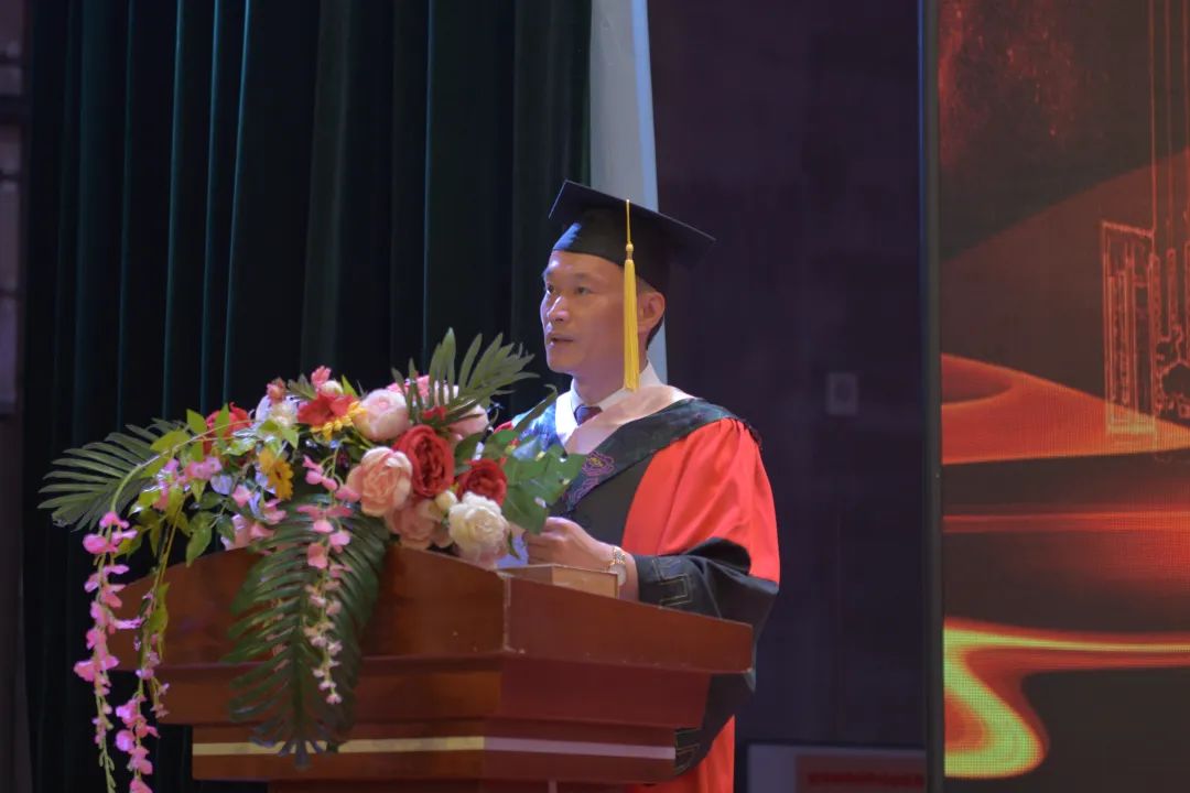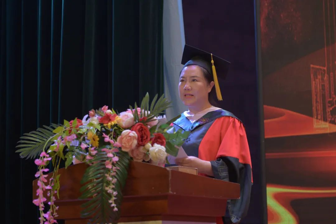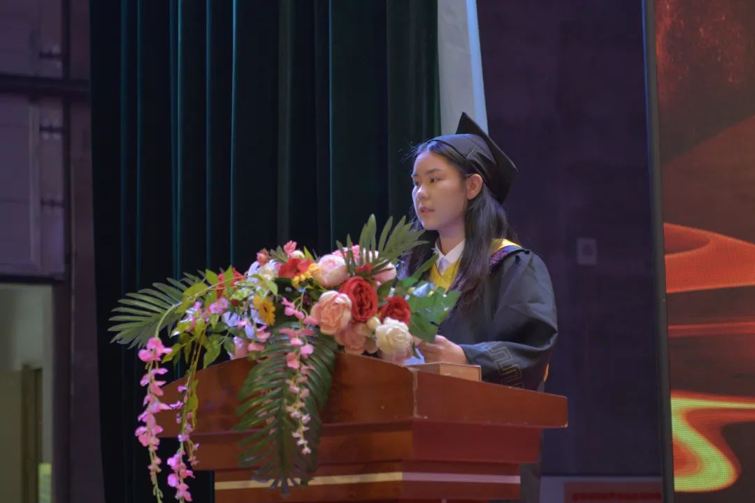 教师代表、语言文化学院吴哲副教授深情勉励毕业生牢记初心,坚守热爱。修炼格局,上好人生必修课。勇于面对挫折,始终勇往直前。毕业生代表、智能制造学院刘赵玉发言中表达了对母校的无限眷恋、对老师感恩与爱戴,表示将铭记“崇德至善,笃学强能”校训,勇于接受挑战,不断为梦想拼搏。
