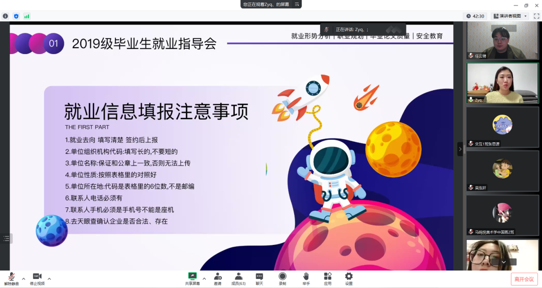 朱羽琪老师分别就就业形势分析、学业预警、毕业论文质量和安全教育相关事宜做了细致的总结。由于毕业、就业涉及较多的手续流程,为有效减少毕业生在实际操作过程中的困惑,朱羽琪老师列明具体的实操步骤和注意事项,并对毕业生就业方面问题做出解答,对当下就业市场以及行业发展趋势进行了详细的分析,并强调毕业生通过个人定位与职业规划明确竞争优势,同时不断提升个人职业技能和综合实力增加求职竞争力。