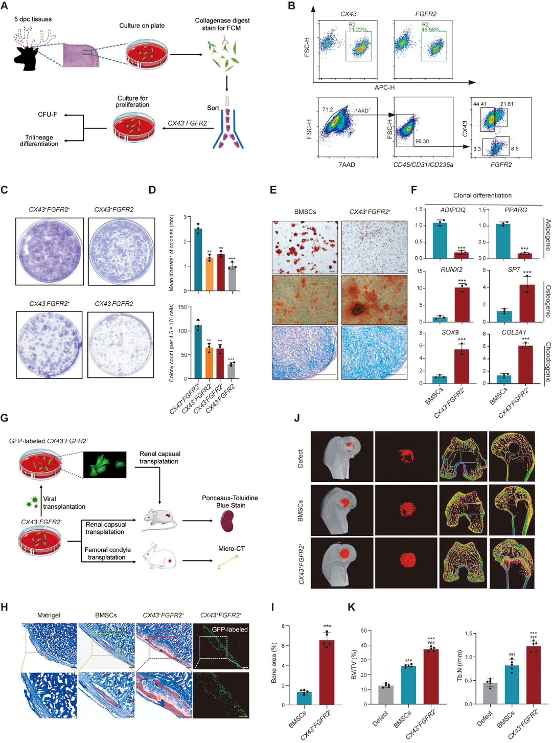 随着研究人员对ABPCs的分析逐步深入,鹿茸能够快速生长的奥秘也随之揭开。利用表面特征标志物(FGFR2和CX43),研究人员将ABPCs从鹿茸再生5天组织中分离出来进行研究。相比人类骨髓干细胞(BMSCs),ABPCs有更强的自我更新能力,以及更显著的成软骨和成骨的能力。裸鼠肾囊膜下异位成骨模型以及兔子骨缺损修复模型的实验结果,进一步证实ABPCs的骨骼修复能力显著优于大鼠BMSCs,为骨骼再生医学研究提供了一类新的干细胞类群。
