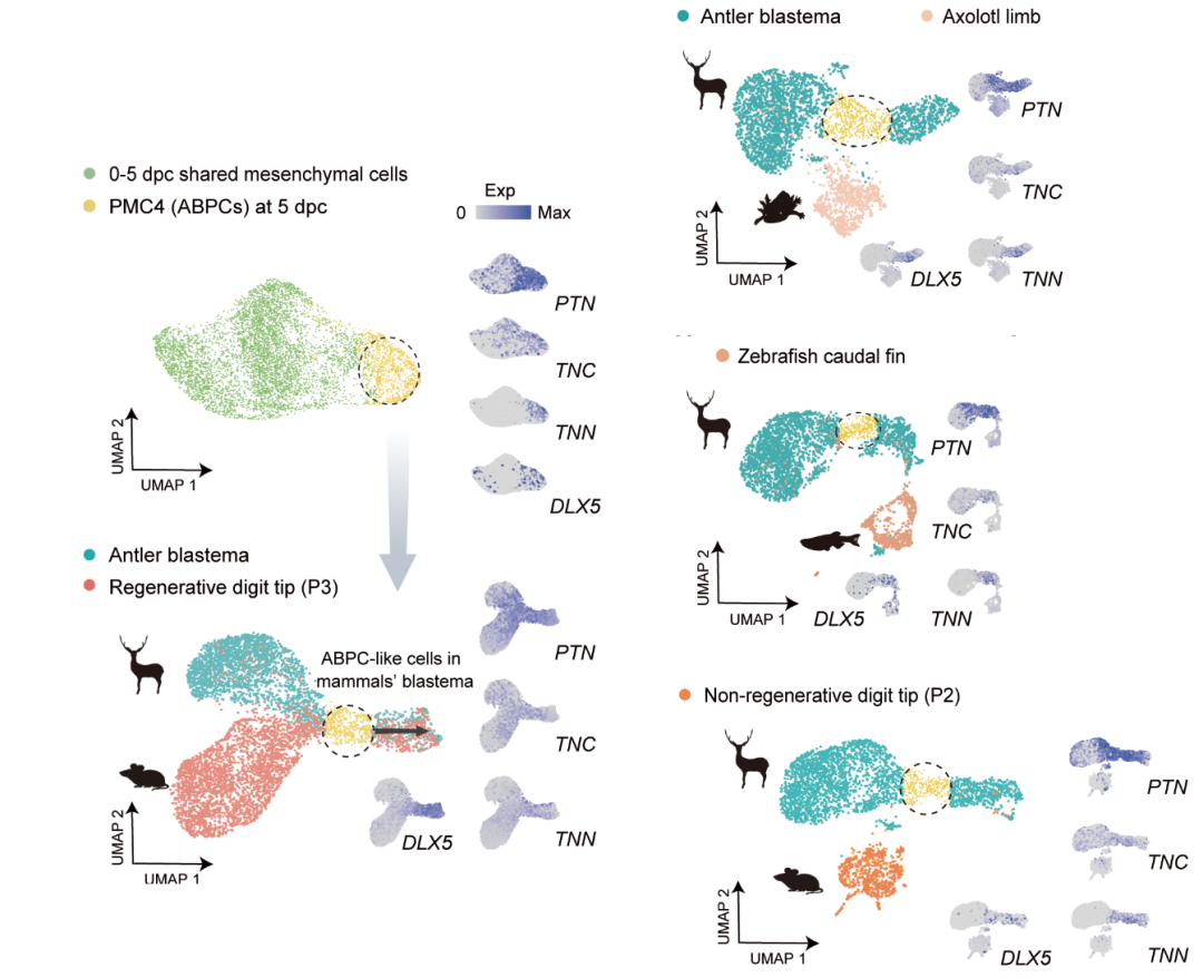 研究作者将鹿茸再生芽基的单细胞转录组数据与可再生的小鼠指尖、不可再生的小鼠指尖、蝾螈四肢和斑马鱼尾鳍的再生芽基单细胞转录组数据进行了分析比较,发现可再生的小鼠指尖芽基中存在类似于ABPCs的细胞群,而其它芽基中不存在这群细胞。这一差异提示,哺乳动物与其它非哺乳动物有着不同的再生机制,而ABPCs或许在哺乳动物的附肢再生中发挥重要作用。