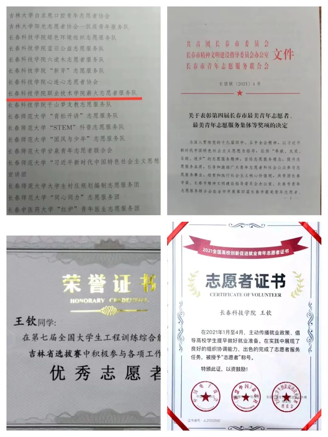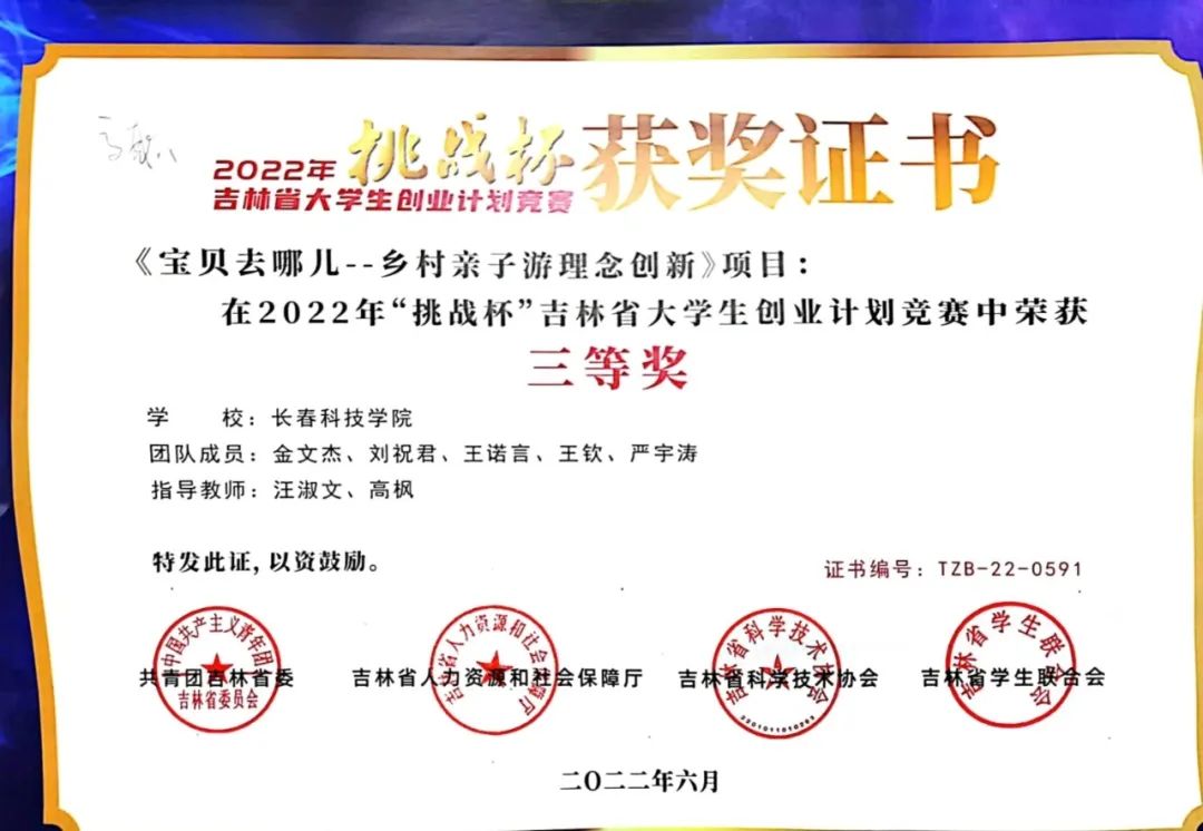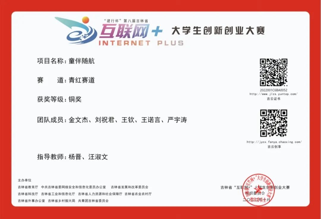 在创新创业及社会实践比赛中,他所在的团队获得第八届“全国大学生互联网+创新创业大赛”省铜奖;第十三届“挑战杯”中国大学生创业计划竞赛省三等奖。参加的“职业技术学院薪火志愿服务队”获评“长春市优秀青年志愿服务集体”。