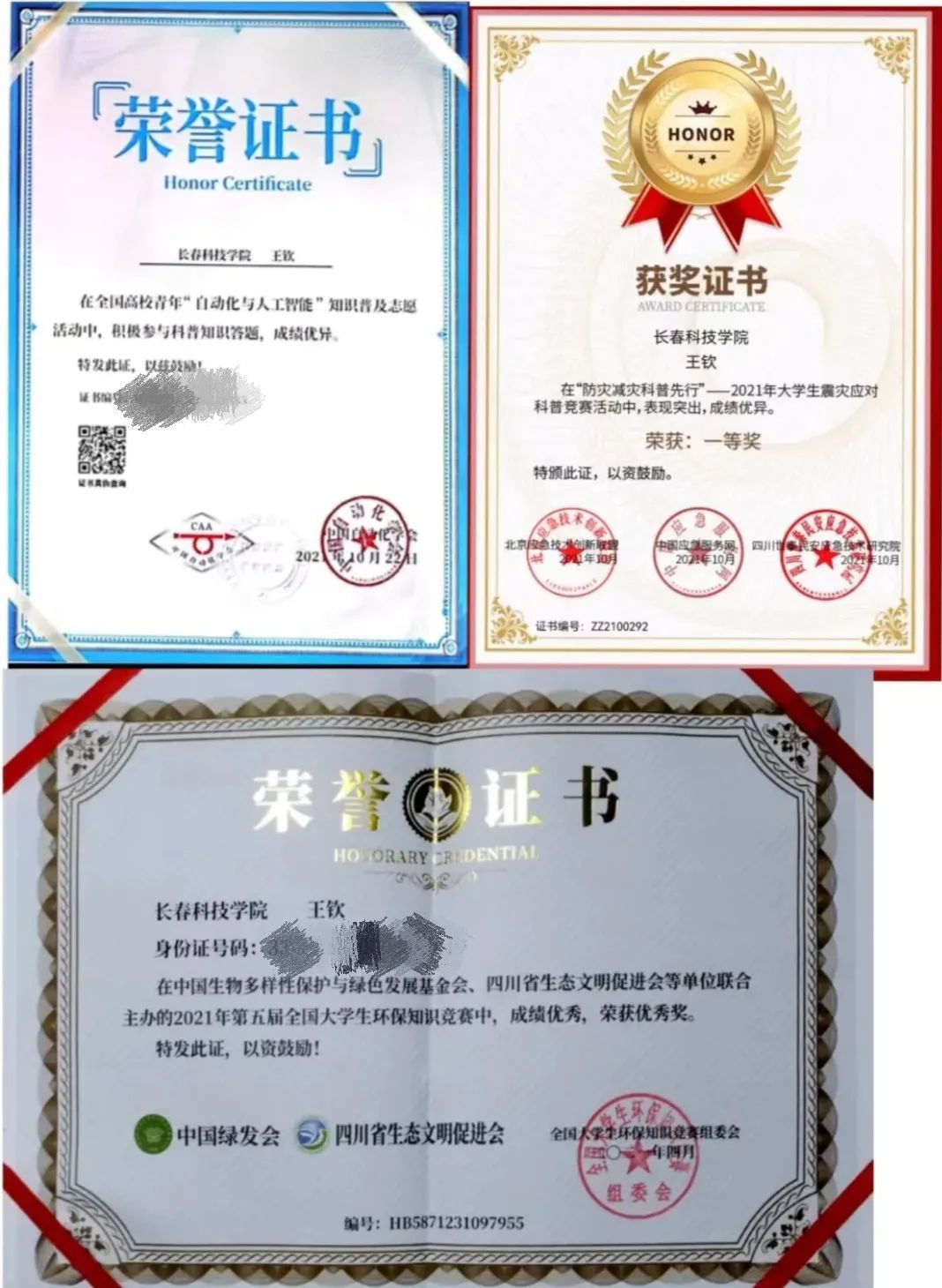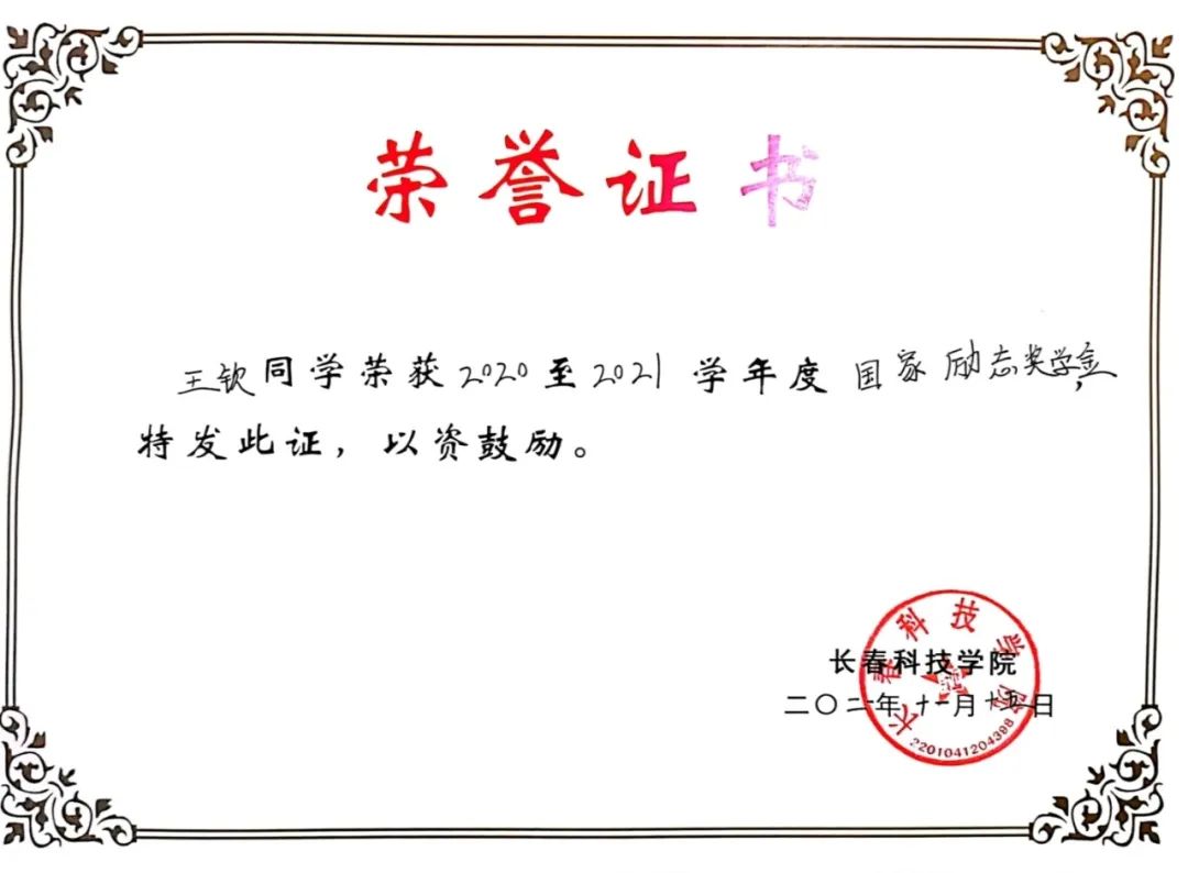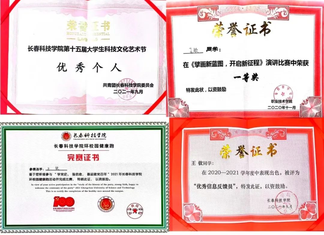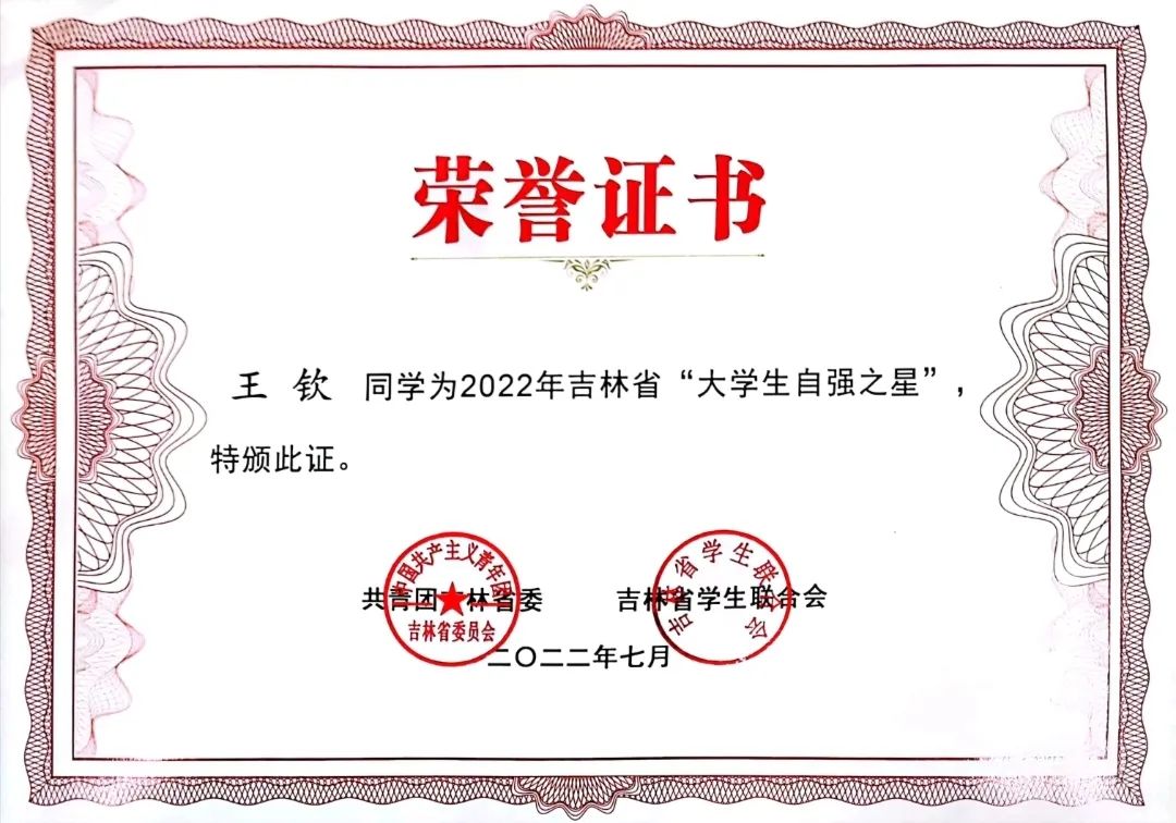 在个人荣誉方面,在2022年7月荣获吉林省“大学生自强之星”称号。2021年12月,他带领班级获评2020年度长春市高校文明杯竞赛“文明班级”。