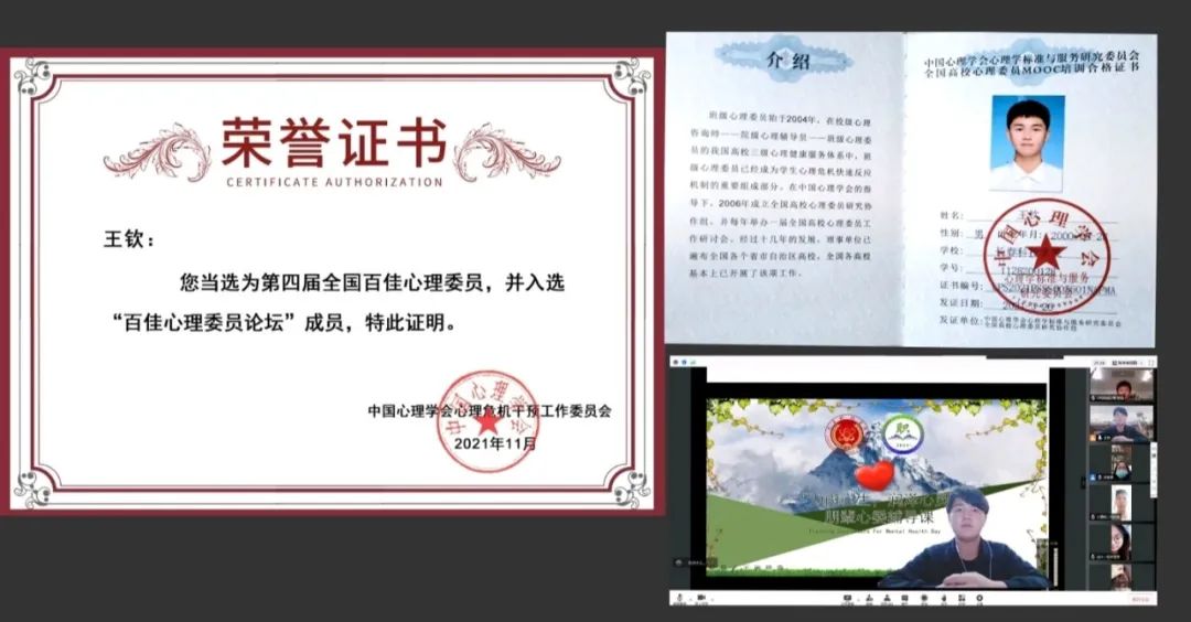 自入学以来,他在班级担任心理委员,负责班级同学心理工作,从2020年起担任学院心理工作学生负责人。在第四届全国心理论坛中荣获“全国百佳心理委员”称号;在进行心理工作中,曾被中国吉林网报道。