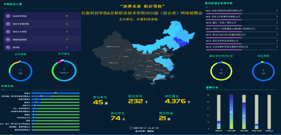 本次招聘会共吸引全国45家企业参会,参会企业包括制造业、批发和零售业、信息传输软件和信息技术服务业、教育、建筑业等多个行业领域,其中民营企业22家,国有企业和三资企业23家,专业需求涵盖学校全部学科专业,共提供4376个就业岗位。学校与吉林职业技术学院共有112名毕业生入场参会,投递简历56份。