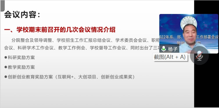 会议中,杨继院长首先针对2022年寒假前学校召开的几次会议中的重要内容及发布的各项奖励方案进行解读,鼓励教师积极参与教科研及大赛项目的申报。明确了学院领导层的职责分工并希望各系、室、部负责人能从专业及学科发展,教师成长等方面着手,制定出负责人工作职责。围绕人才培养方案制定,省、校级课程建设及一流专业建设,实验室、实训室、竞赛平台建设管理,教师队伍建设等内容部署了假期及2023年主要工作,并初步制定了各项工作的起止时间及主要负责人。在回顾学院各专业2022年招生情况时,杨继院长强调要以专业生存危机意识为内驱力,加强2023年专业解读和专业宣传的力度。针对教科研、创新竞赛工作,学院制定了3-5年计划,做到三个提高,即:提高教师教科研工作水平,提高教科研工作管理,提高广大教师的业务能力,打造一支素质过硬、业务精湛的师资队伍。针对学生管理教育工作,学院要加强人文环境建设,提高学生对学院、专业及教师的认同感。以教学和学生为中心开展学院各项活动,实现教、学、管协同发展。会议最后,杨院长希望各系、部、室负责人能围绕专业怎么办,教科研如何开展,校企合作如何深度融合等进行深入思考。