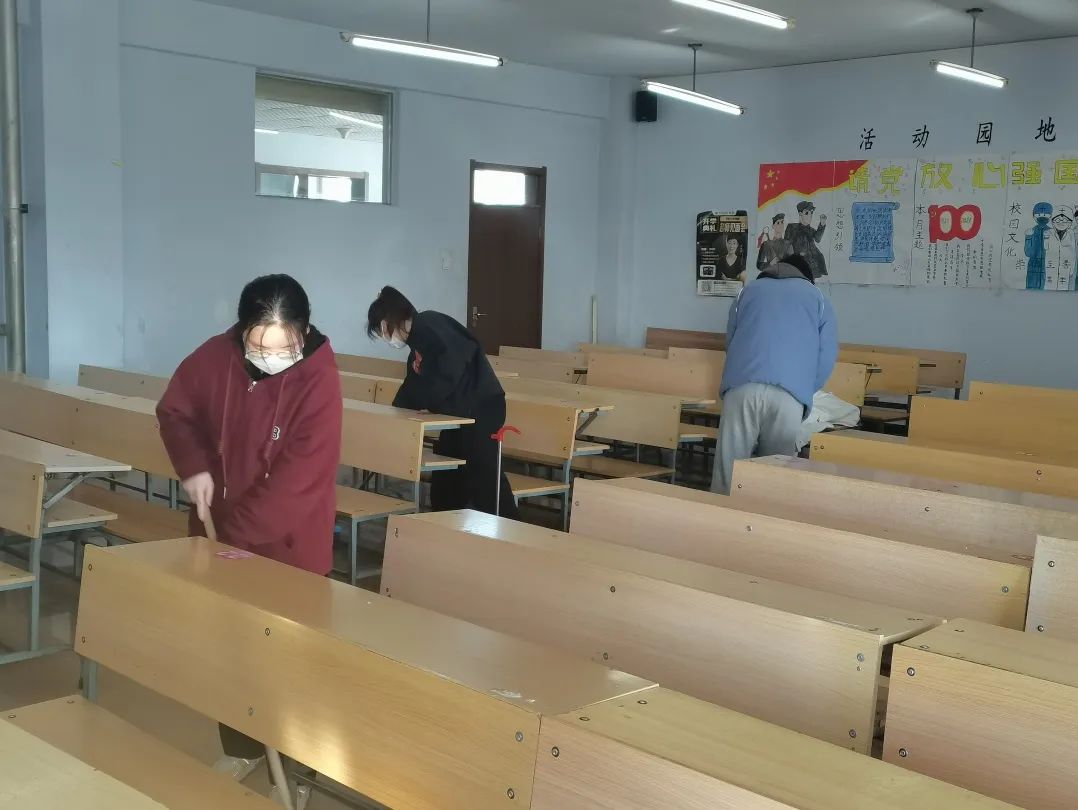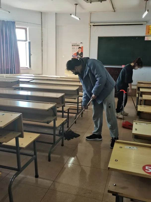 学院志愿者满腔热血,积极准备,有序开展卫生打扫工作。同学们清扫地面垃圾,擦拭积满灰尘的黑板与桌面。每一位志愿者都分工明确,井井有序的进行着,经过志愿者们的细心打扫,使教室面貌焕然一新,给同学们营造出了一个良好的学习环境。