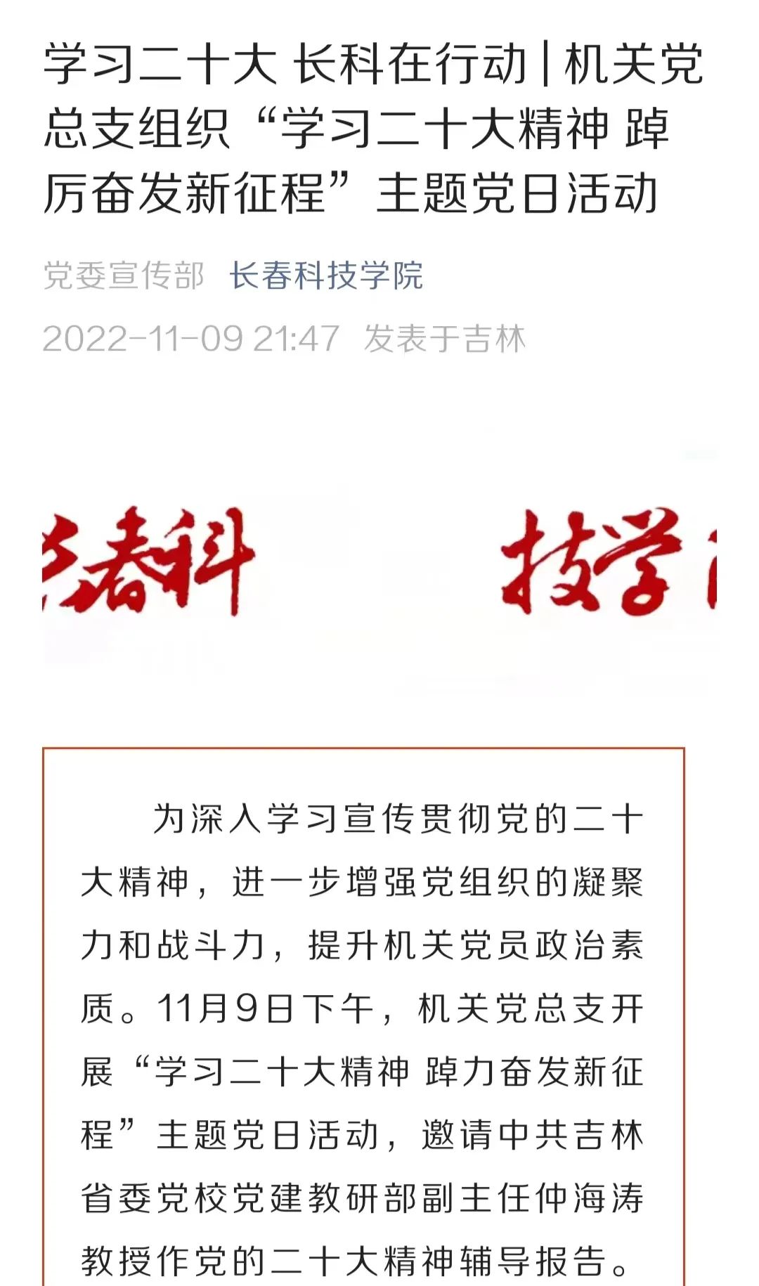 “新时代十年伟大变革,在党史、新中国史、改革开放史、社会主义发展史、中华民族发展史上具有里程碑意义。”……11月9日,长春科技学院邀请吉林省委党校党建教研部副主任仲海涛教授作专题报告。