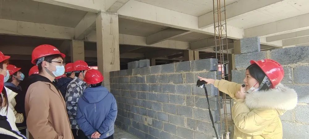 介绍完外部环境后,杨光老师和尚美珺老师带领大家进入教学楼主体一楼,尚美珺老师为同学们指出了主梁与次梁、柱等构件,在工地里,我们看到了一些堆放在地上的空心砌块,是准备砌筑框架填充墙的材料,老师又向大家拓展了一些与其相关的专业知识。