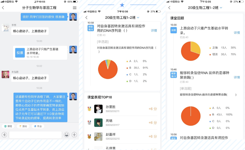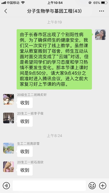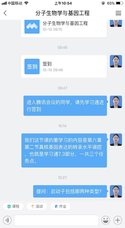 在授课内容准备上,刘莹老师在开学授课时就创建了《分子生物学与基因工程》的微信学习群,通过该群会在课前对线上课的课程时间进行提醒,同时学生可以在群里与老师针对教学内容、知识点进行互动交流。同时为保证学生按时出勤并认真学习,刘莹老师会采取学习通签到以及任务点完成度的双重考核方式进行出勤考核。