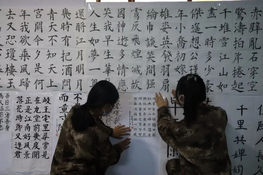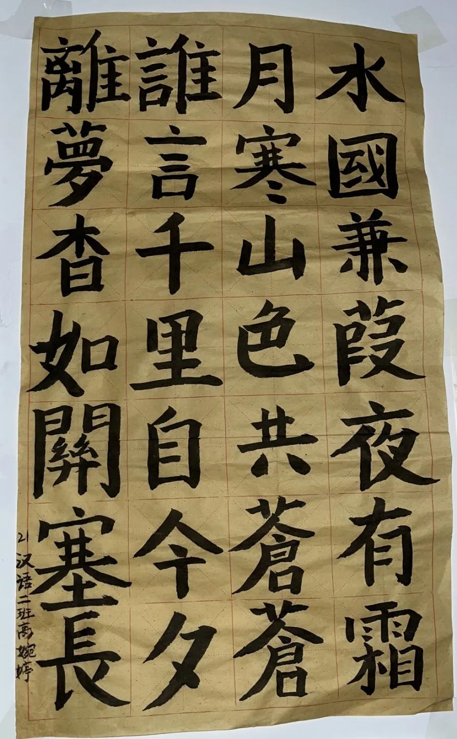 此次比赛以班级为单位,由2021级和2022级汉语国际教育专业全体学生自行选择参赛书法作品,内容以临摹诗歌碑帖为主。比赛现场,学生们个个满怀激情,用心书写每一个笔画、每一个汉字,他们坐姿端正,握笔正确,展示出良好的书写习惯。学生们所写的作品笔画流畅、结构匀称、整体美观,横竖撇捺之中,饱含着良苦用心,行云流水之间,书写着青春风采。