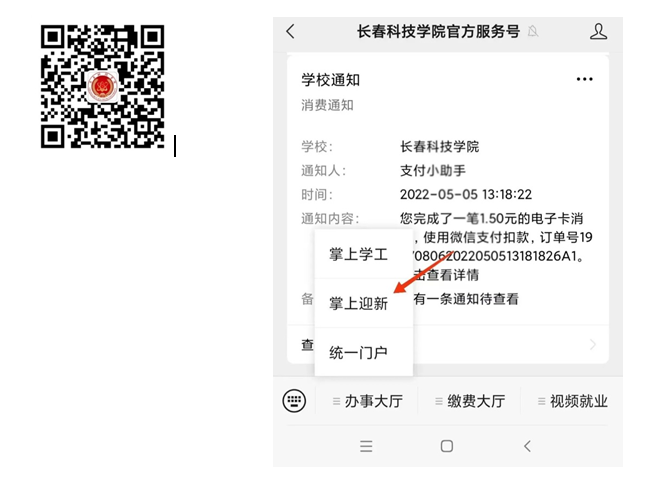 第一步:通过微信扫描如下二维码关注“长春科技学院官方服务号”→打开“办事大厅”→“掌上迎新”界面完成线上报到。